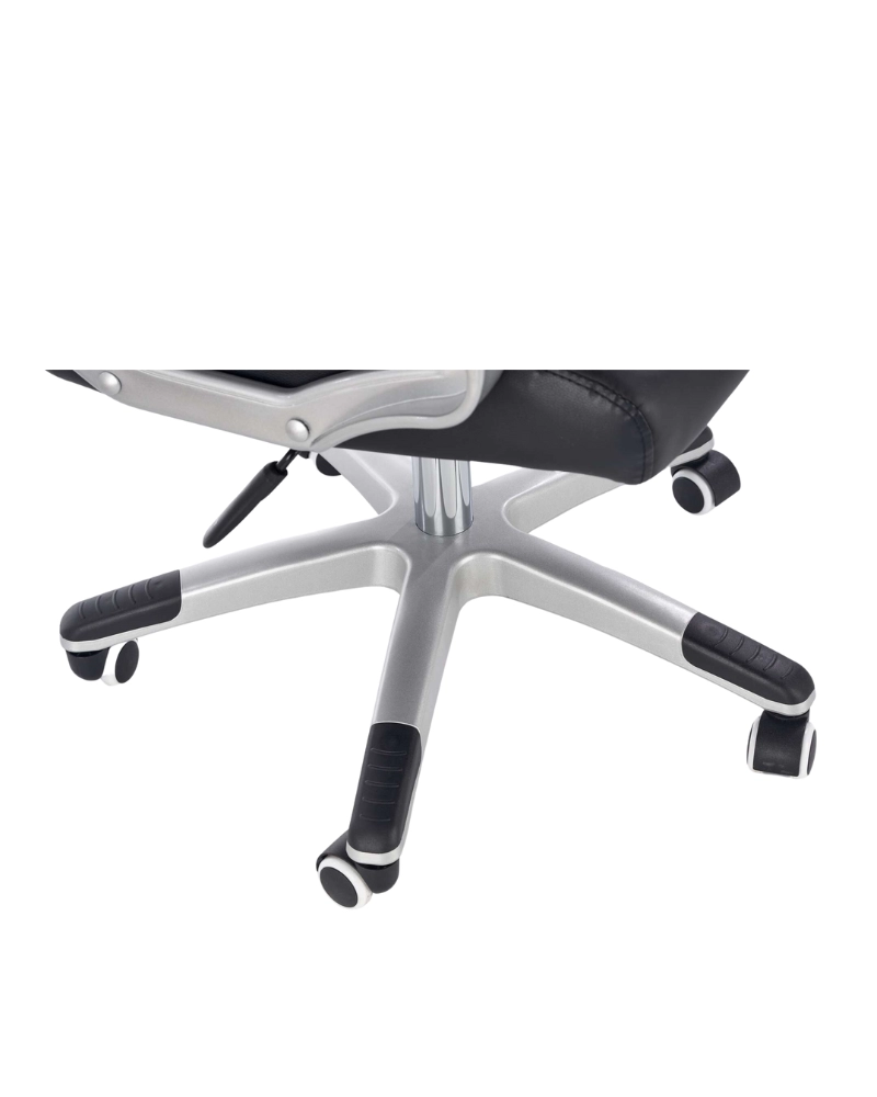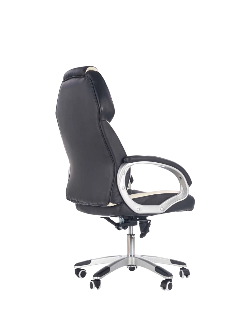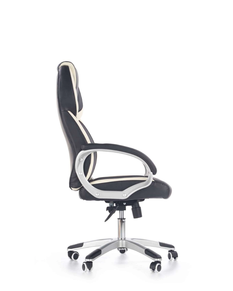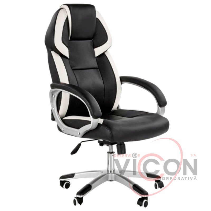 Șezutul confortabil și spătarul ergonomic sunt tapețate cu piele eco perforată, de culoare neagră cu inserții de piele eco de culoare albă. Cotierele moale căptușite sunt realizate din plastic rezistent, iar baza fotoliului - din metal cromat.