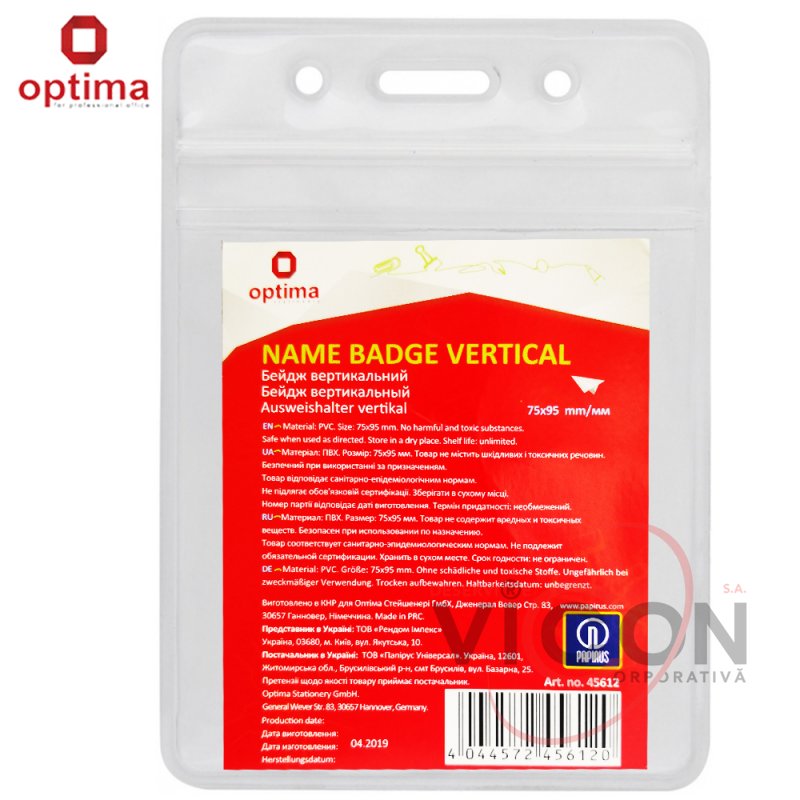 Ecuson vertical, 75 х 95 mm, închidere cu fermoar zip lock, PVC, OPTIMA