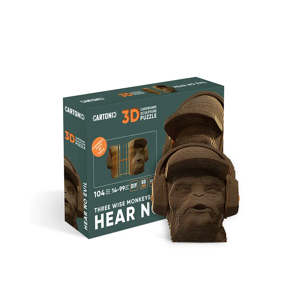 Trei maimuțe înțelepte. Three Wise Monkeys. Hear No Evil este un puzzle 3D din carton de la Cartonic din colecția simbolică "Three Wise Monkeys" într-o interpretare modernă. Fiecare dintre cele trei maimuțe este caracterizată de un gest diferit: una își acoperă ochii, alta își acoperă gura, iar a treia își acoperă urechile. În fața ta se află puzzle-ul "Hear No Evil", care te îndeamnă să nu asculți ceea ce este neadevărat, jignitor și inutil pentru tine. Colecționează întreaga colecție de puzzle-uri împreună cu familia sau prietenii, inspiră-te din înțelepciunea japoneză și fă-ți un spațiu unic. Cartonic - transformă cartonul într-o adevărată ARTĂ!