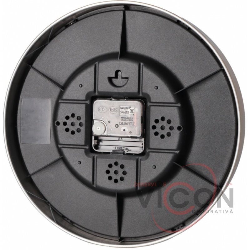 Ceas de perete; ramă din metal; alergare liniștită; forma rotunda; diametru - 25,2 cm; tip mecanism: cuarț; baterie: baterie AA x 1 buc (bateria nu este inclusă); Datorită mecanismului convenabil, acestea sunt rapid demontate/asamblate.