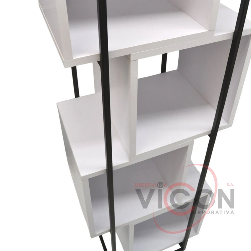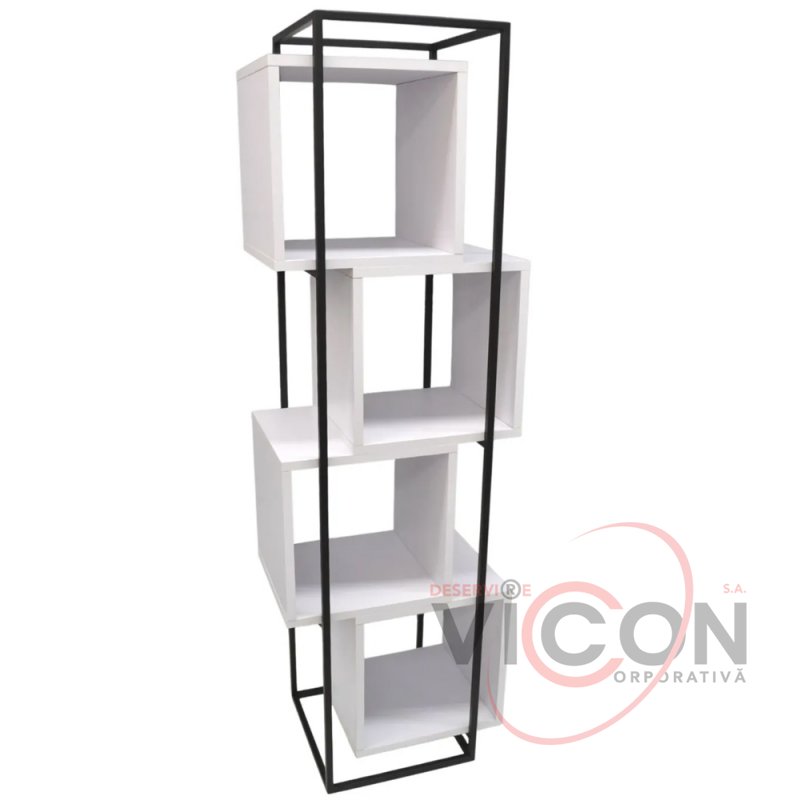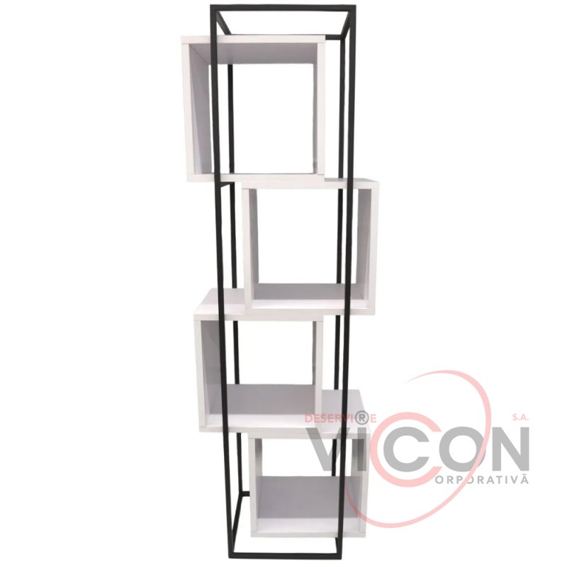 Fabricat pe o structură metalică sudată rezistentă, vopsit în câmp electrostatic și blat din PAL melaminat cantuit, raftul dispune de 4 polițe deschise pentru păstrarea bunurilor și materialelor precum cartușe, cerneală, hârtie și accesorii birotică.
