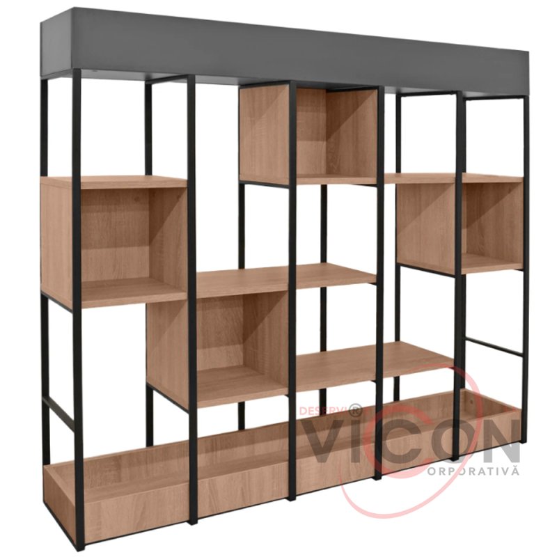 Raftul dispune de 5 polițe deschise pentru păstrarea bunurilor și materialelor precum cartușe, cerneală, hârtie și accesorii birotică.