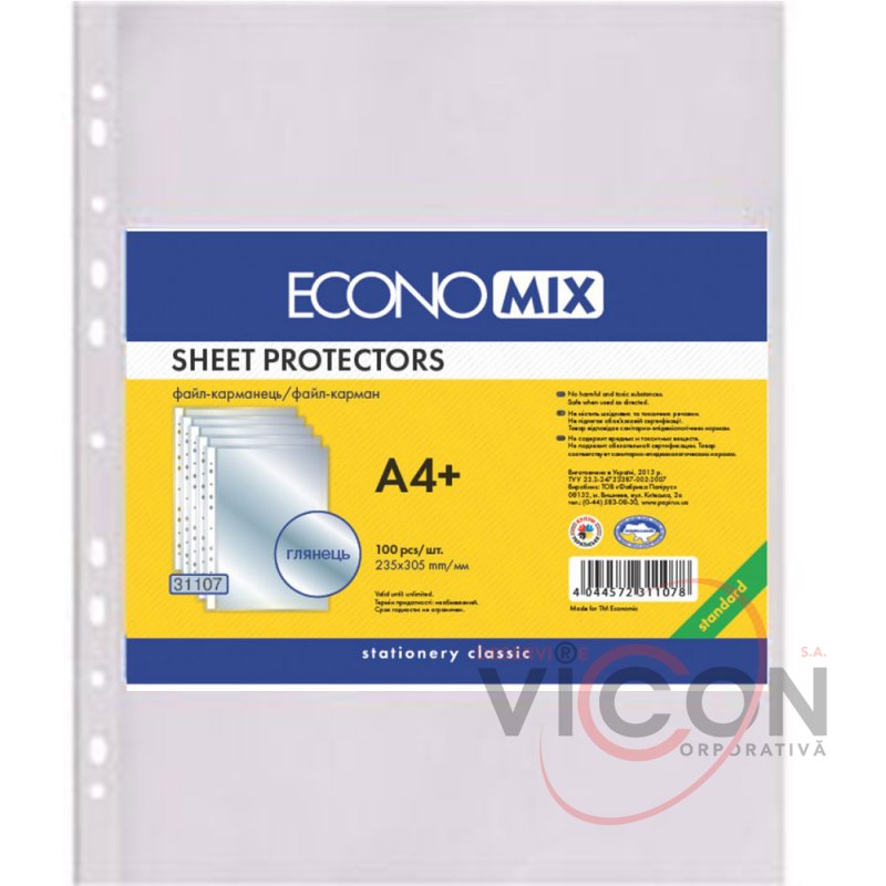 Folii pentru documente A4+ Economix, 40 µm, textură „lucioasă”, cotor transparent (100 buc./pachet)