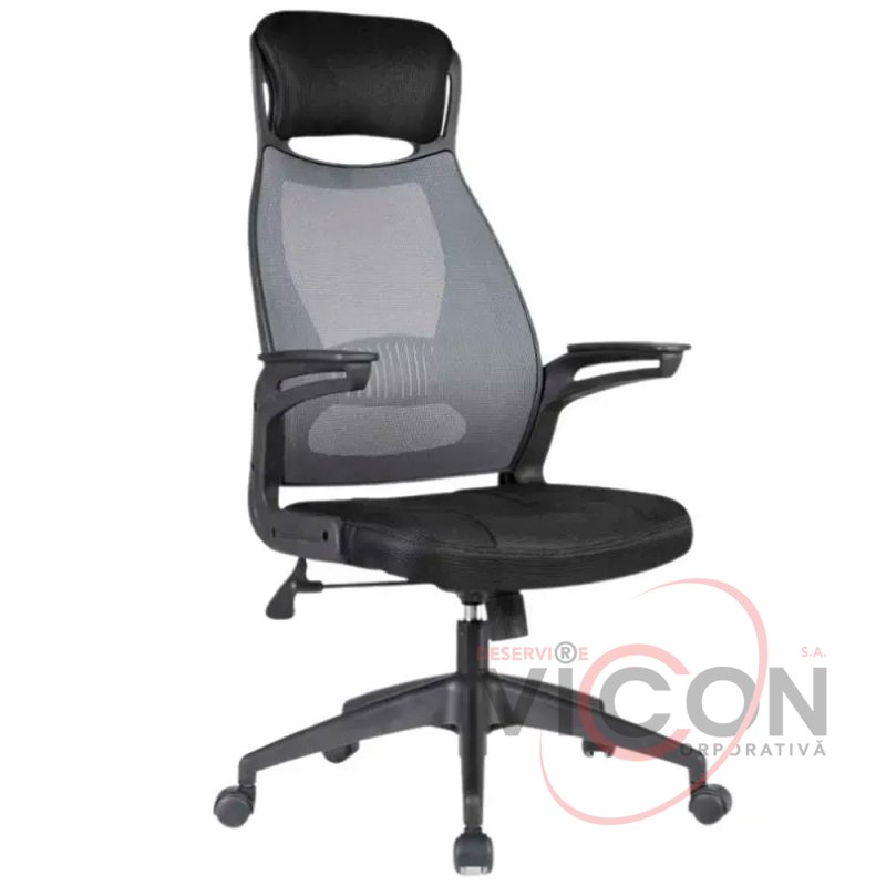Spătarul este tapițat cu plasă de culoare neagră pentru o circulație excelentă a aerului.