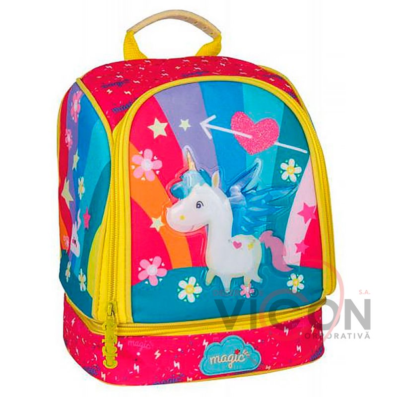 Dimensiune 24 * 20 * 12 cm; greutate 250 g; material: exterior - poliester 300 D, interior - țesătură termică; mâner robust cu capac de cauciuc; curele reglabile; 2 compartimente: 1 general și 1 pentru sandvișuri; design rucsac luminat.
