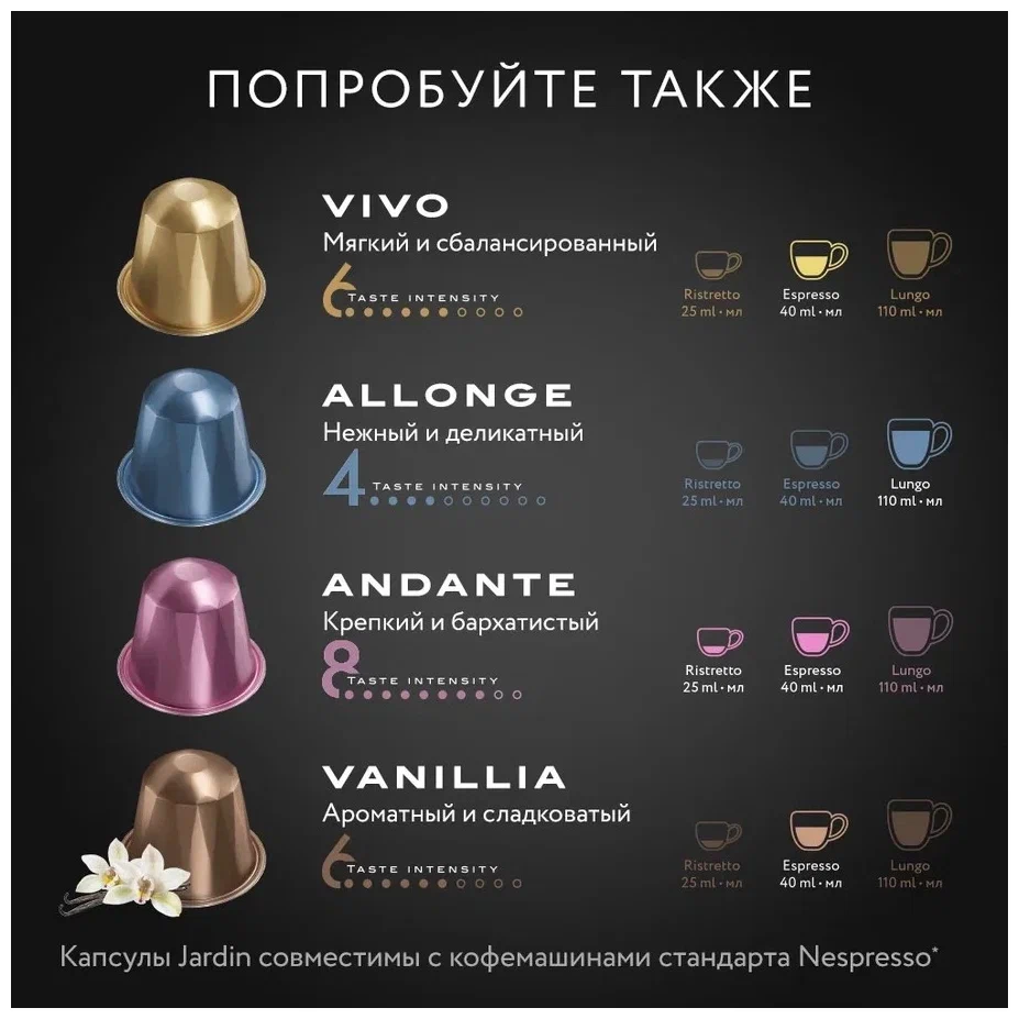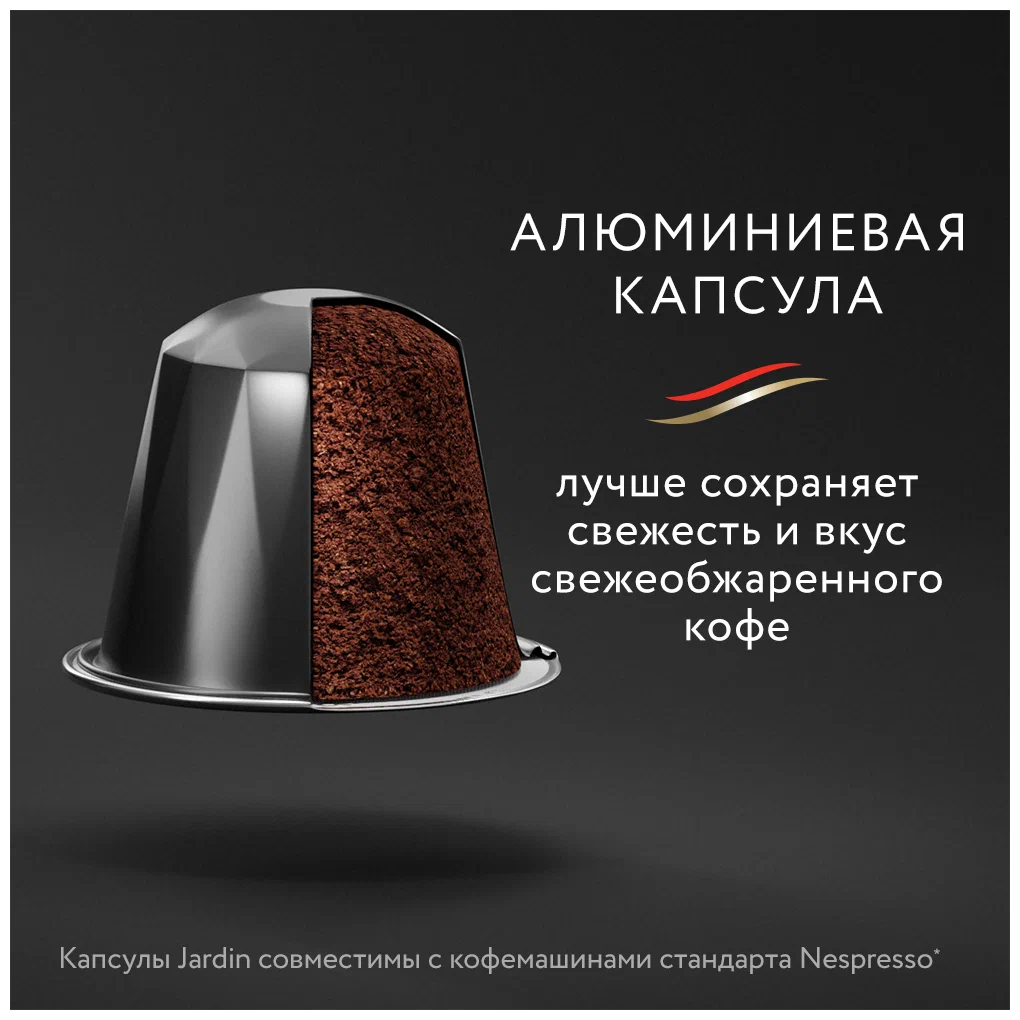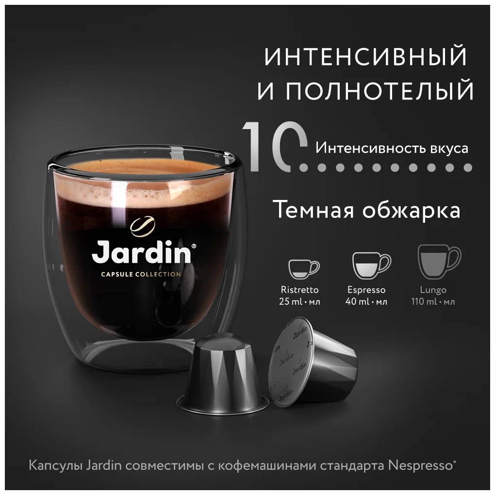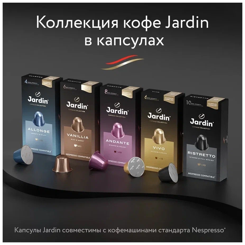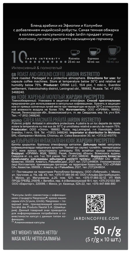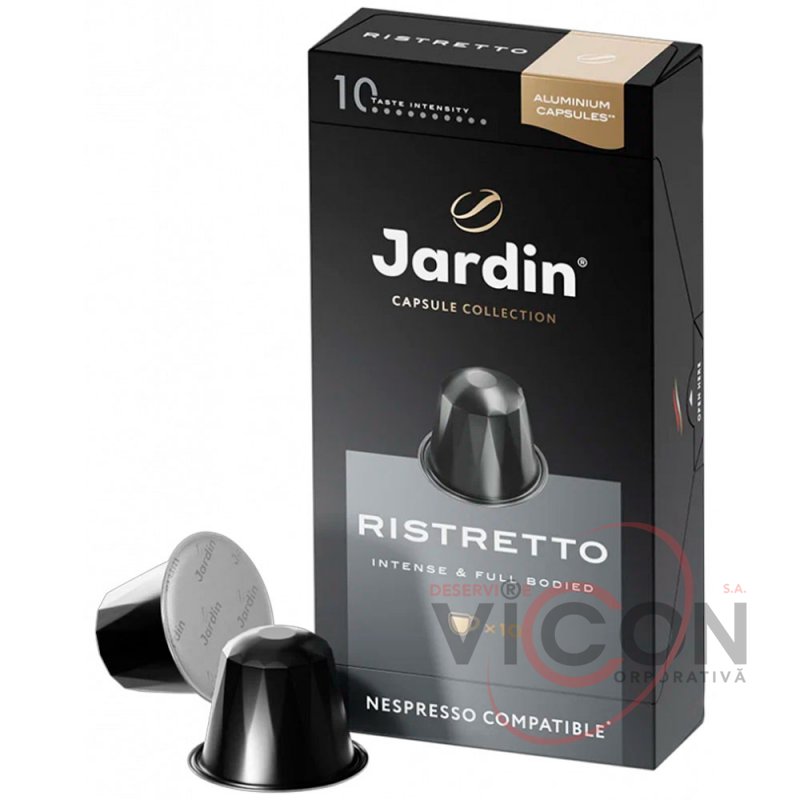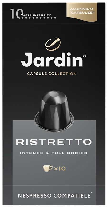 Capsulele Jardin Nespresso Ristretto 10 au la bază un amestec de cafea Arabica etiopiană și columbiană și Robusta indiană, prăjită închis. Cafeaua este măcinată fin și apoi plasată în mini-containere speciale de 5 grame din plastic alimentar. Acestea pot fi utilizate în aparatele de cafea Nespresso. Această variantă produce un ristretto italian perfect, cu un gust bogat și puternic și o aromă intensă de ciocolată picantă.