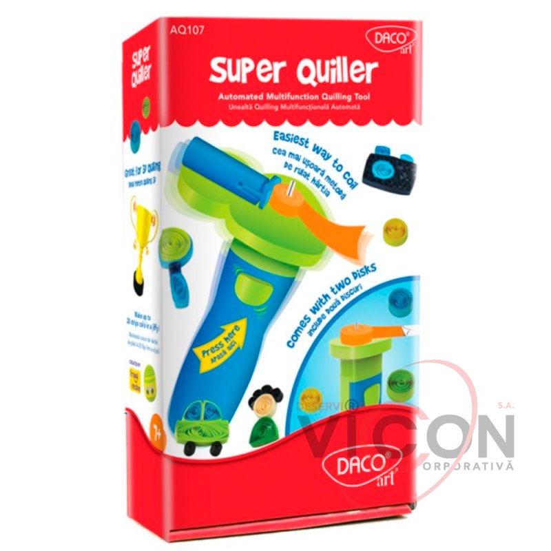 Ești pasionat de arta quilling și îți place să îți petreci timpul liber într-un mod cât mai creativ? Pasiunea ta este mai mult decât un hobby? Îți place să te dezvolți și să realizezi proiecte cât mai frumoase și mai complicate? DACOart îți propune o nouă unealtă de quilling care să te ajute să realizezi cât mai multe proiecte într-un timp cât mai scurt! Acul de quilling electric! Conține: • ac cu despicătura, pentru prinderea fâșiei de hârtie • 2 discuri de rulare • capac de protecție • un set de 200 de fâșii quilling colorate • instrucțiuni de utilizare si păstrare Tot ce trebuie sa faci este sa introduci fâșia de quilling în despicătura acului și să apeși butonul! Acul va face totul pentru tine, nu mai trebuie să pierzi timp rulând manual fâșiile. Acum poți obține cercurile mult mai ușor, economisind timp!