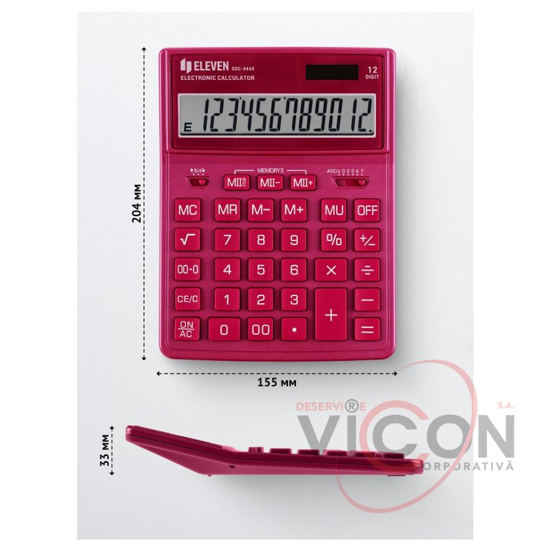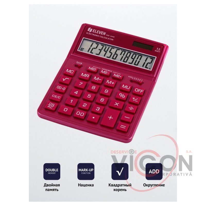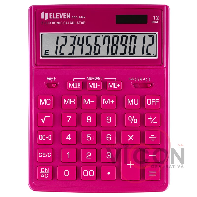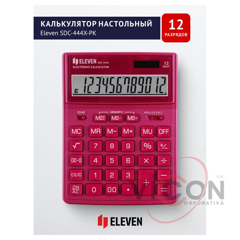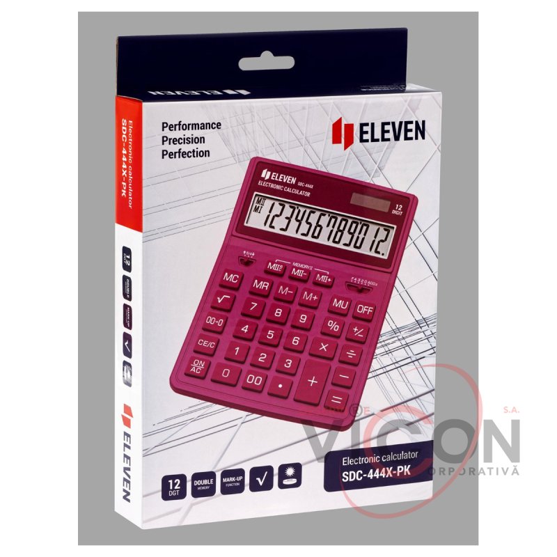 Calculatorul de birou cu 12 cifre Eleven SDC-444X-PK este conceput pentru a efectua operații aritmetice. Setul optim de funcții va ajuta la automatizarea calculelor: calculul rădăcinii pătrate, corectarea ultimei valori introduse, butonul „00”, memoria dublă, calculul marcajului, schimbarea semnului. Alimentarea dublă (panou solar + baterie GP189(LR54)) și oprirea automată măresc durata de viață. Dimensiunea calculatorului - 153 * 199 * 31 mm, greutate - 209 g, culoare - negru. Ambalat într-o cutie de carton.