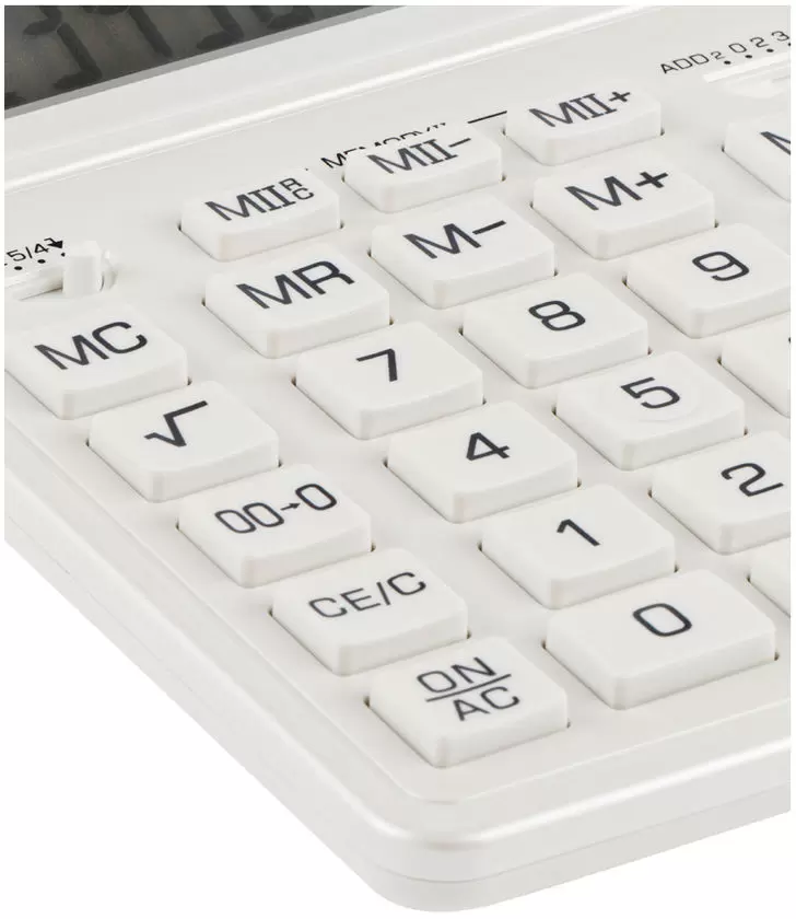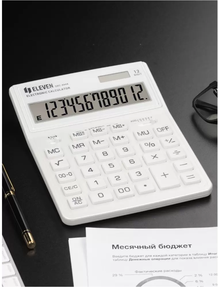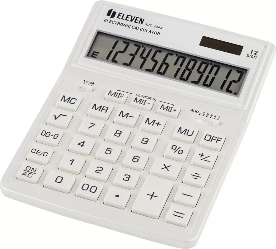 Calculatorul de birou cu 12 cifre Eleven SDC-444X-WH este conceput pentru a efectua operații aritmetice. Setul optim de funcții va ajuta la automatizarea calculelor: calculul rădăcinii pătrate, corectarea ultimei valori introduse, butonul „00”, memoria dublă, calculul marcajului, schimbarea semnului. Alimentarea dublă (panou solar + baterie GP189(LR54)) și oprirea automată măresc durata de viață. Dimensiunile calculatorului - 153 * 199 * 31 mm, greutatea - 209 g, culoarea - negru. Ambalat într-o cutie de carton. Capacitatea cifrelor: 12; - Tipul de alimentare - dublă (baterie solară/baterie GP189(LR54)); - Tasta „00”; - Memorie dublă; - Calculul majorării; - Rădăcină pătrată;