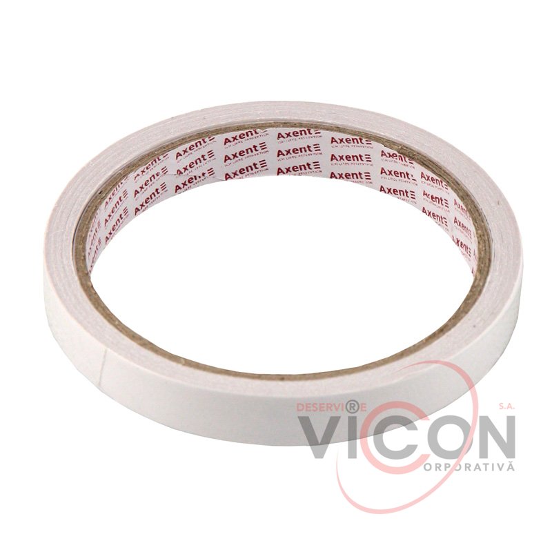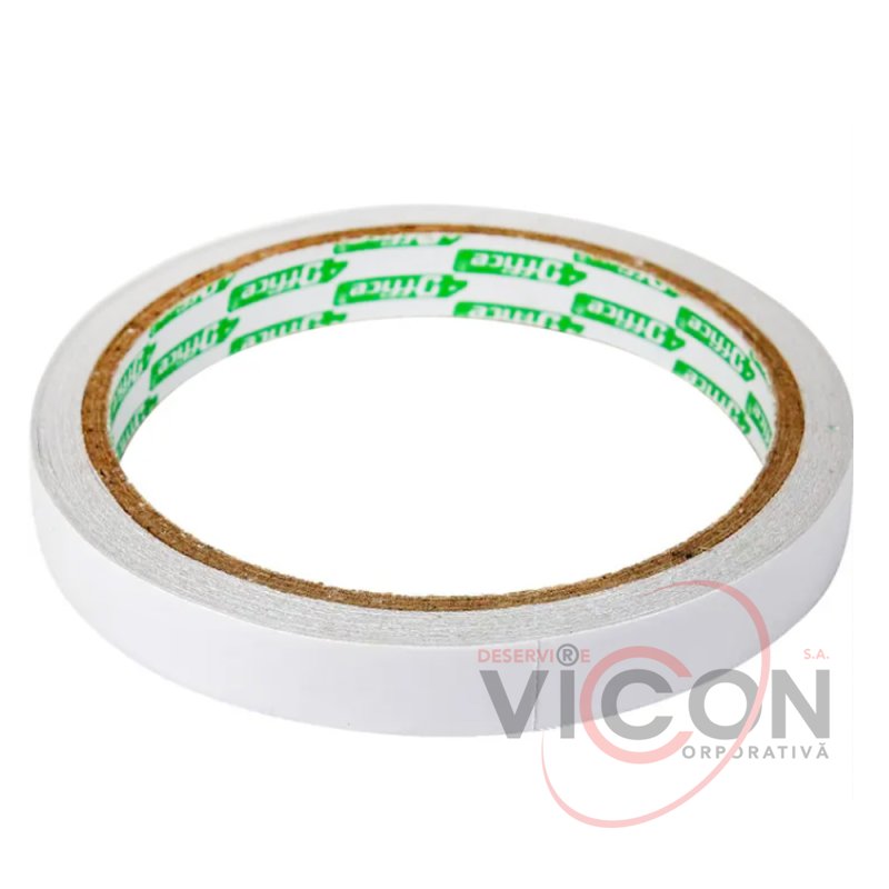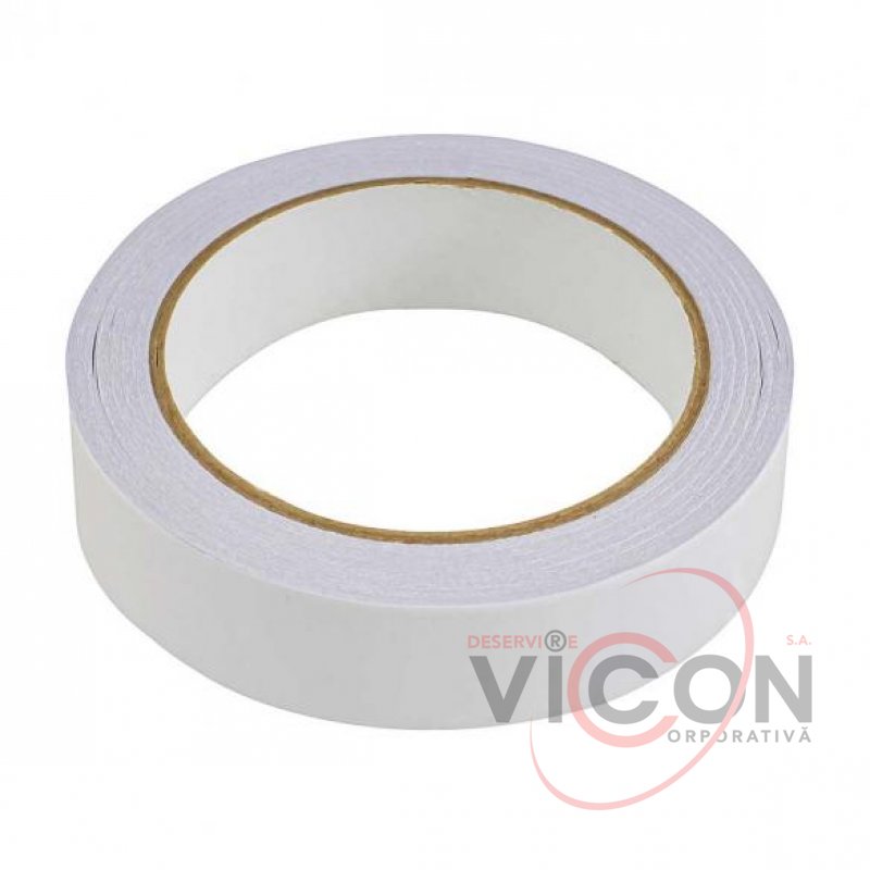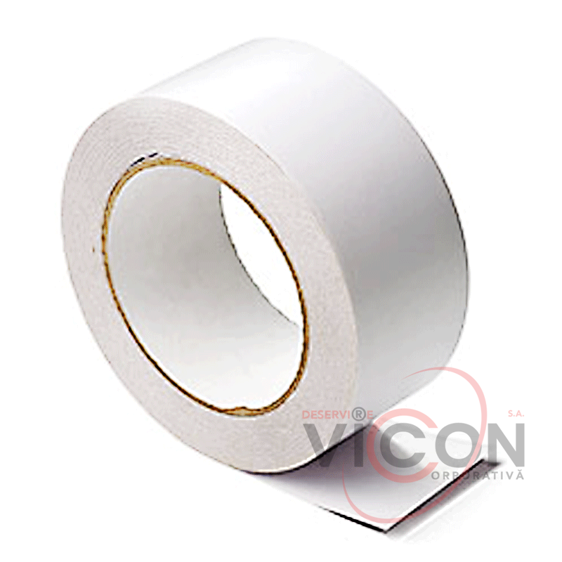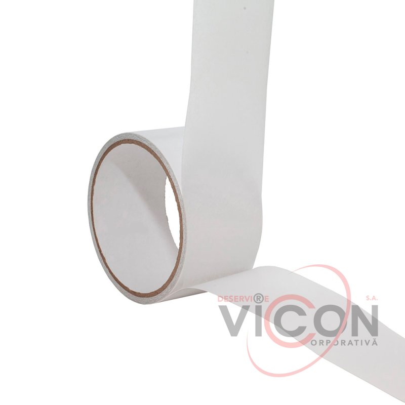 Banda dublu adezivă este realizată pe un suport de hârtie albă.