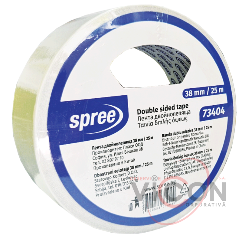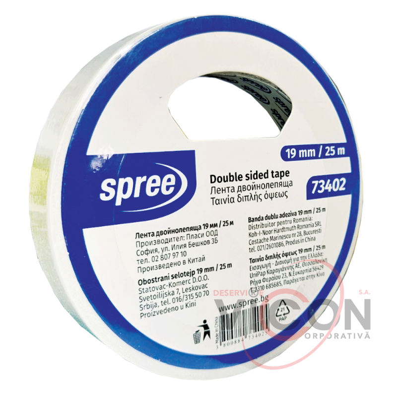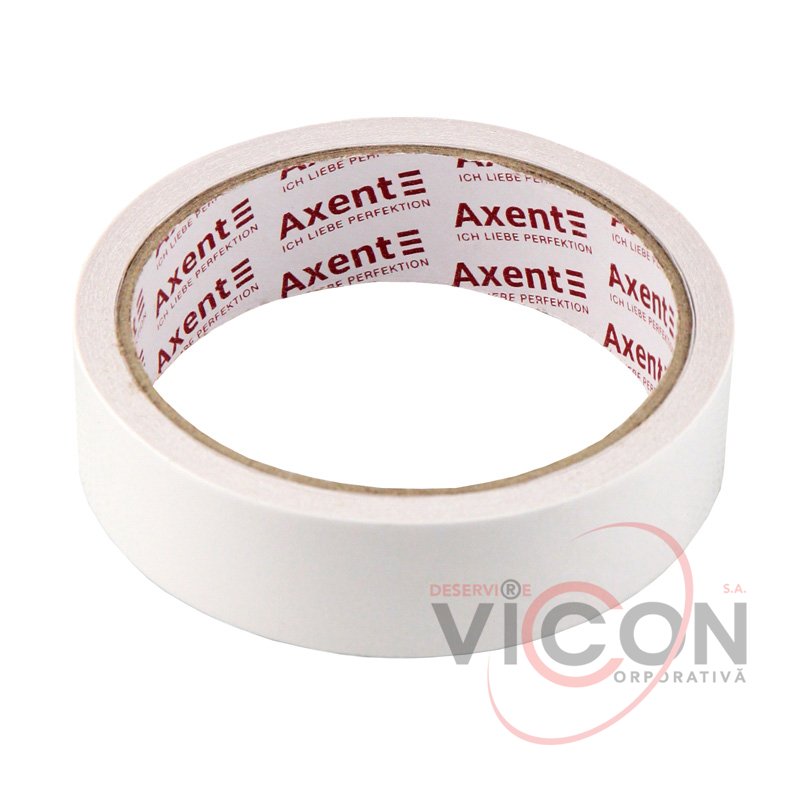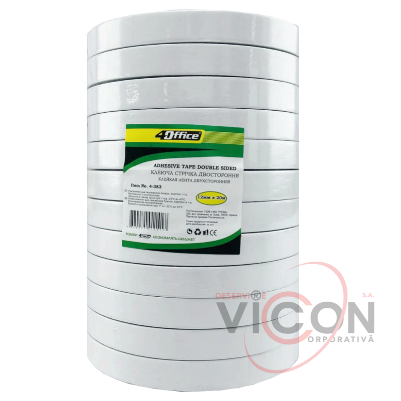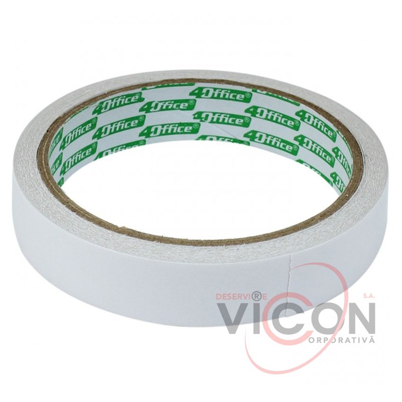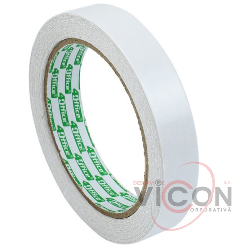 Banda dublu adezivă este realizată pe un suport de hârtie albă.