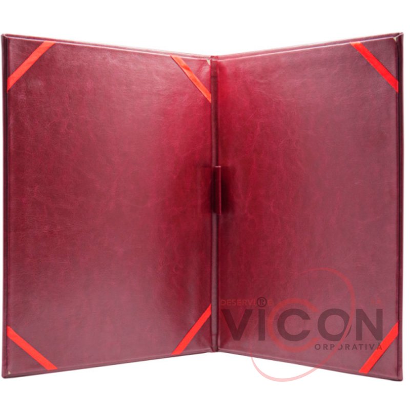 În interior, dosarul este acoperit cu vinil, cu fixare pentru hârtii și pix