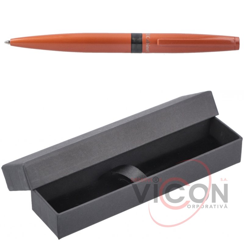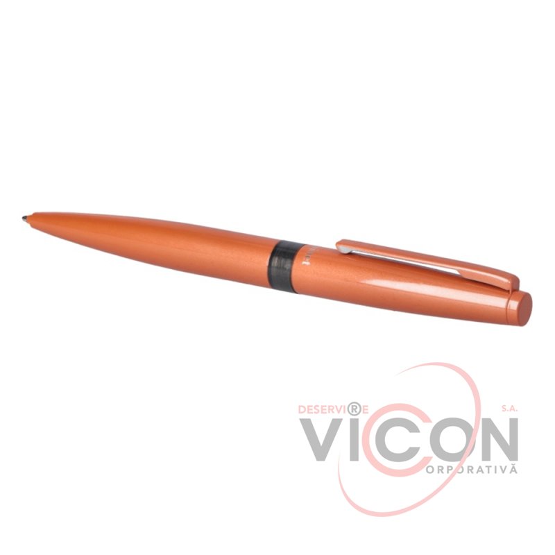 Pix cu mecanism de răsucire; tija - tip PARKER; scrie cu albastru; lungime maner 14 cm; corp metalic lucios, de culoare portocalie, face stiloul mai atractiv; vine cu o cutie cadou.