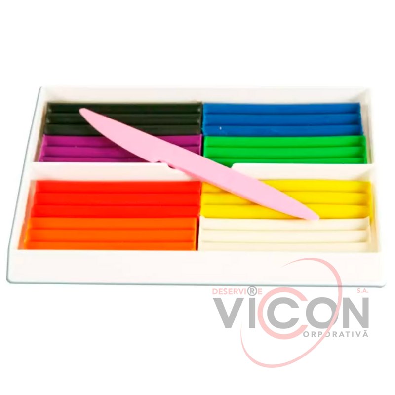 Setul de plastilină este ambalat într-o cutie de carton și vine cu un teanc de plastic (cuțit) pentru modelare.