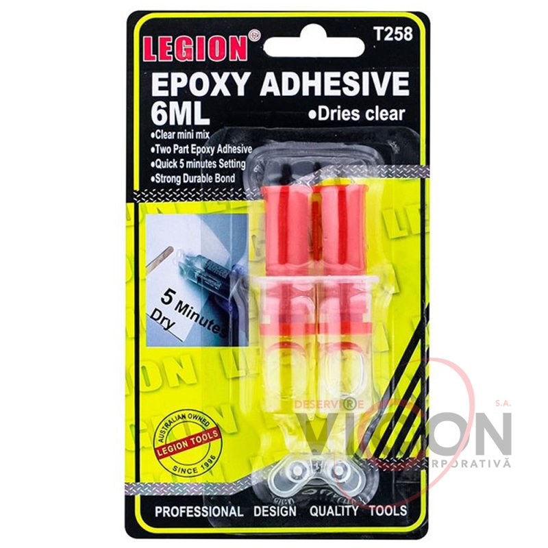 Seringă de lipici epoxidic 6 ml. utilizat pentru lipirea diferitelor piese din metal, lemn, PVC, sticlă, ceramică, porțelan și alte materiale, precum și pentru umplerea fisurilor și așchiilor. Compoziția bicomponentă a adezivului, pe bază de întăritor și rășină epoxidica cu aditivi modificatori, îi permite să se întărească rapid.