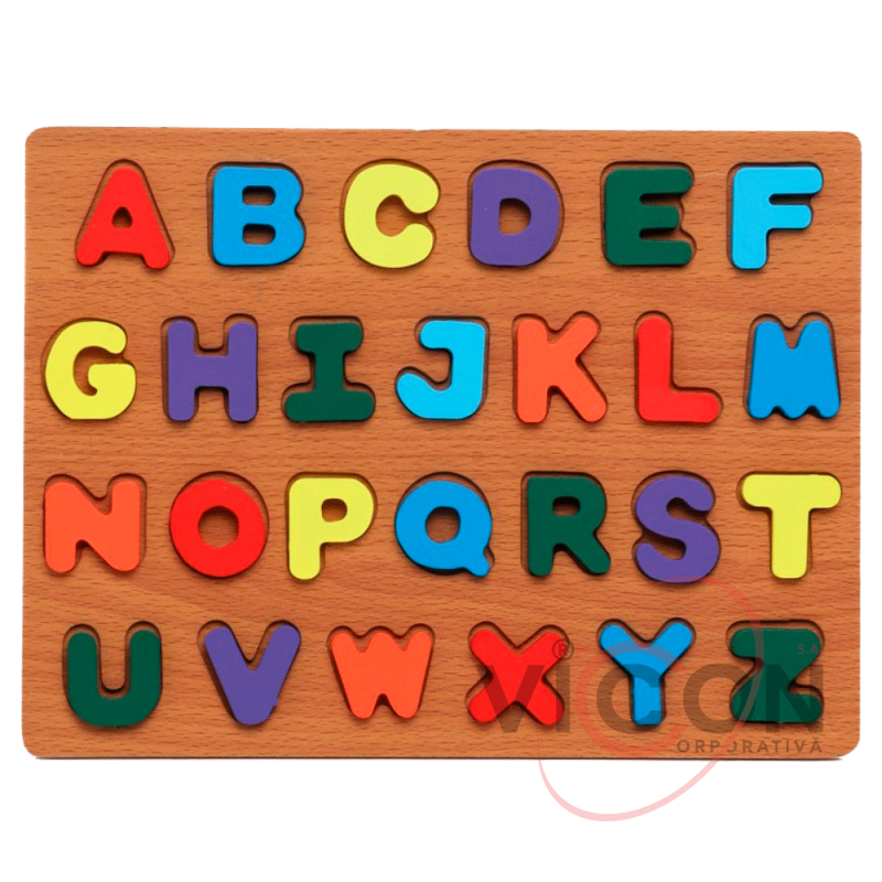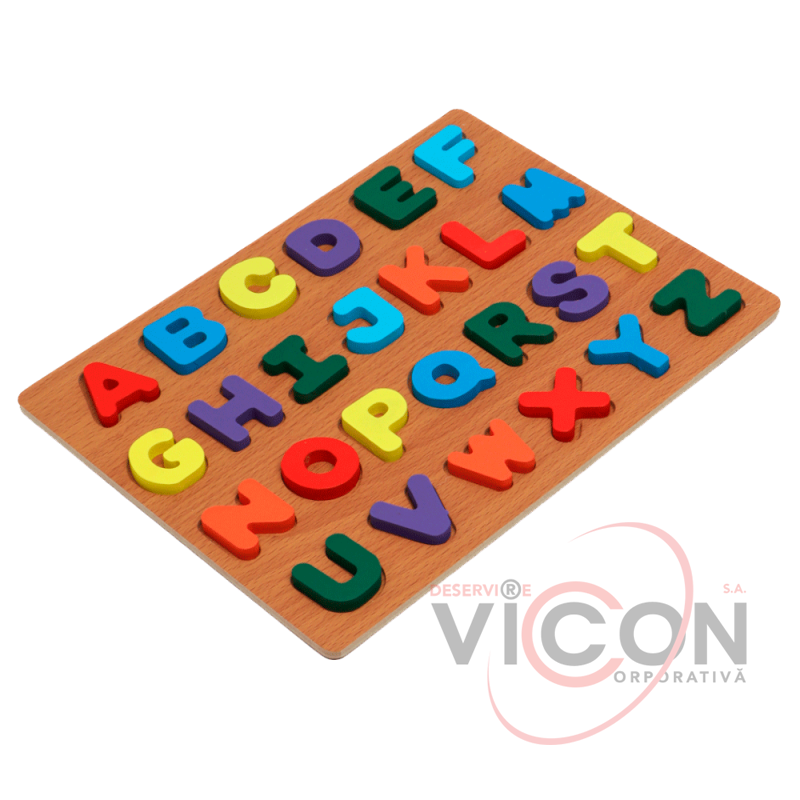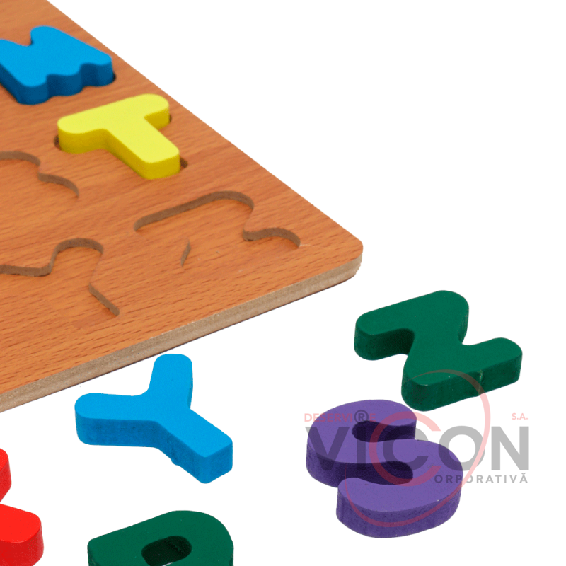 Puzzle-ul din lemn cu litere colorate combină distracția și învățarea.