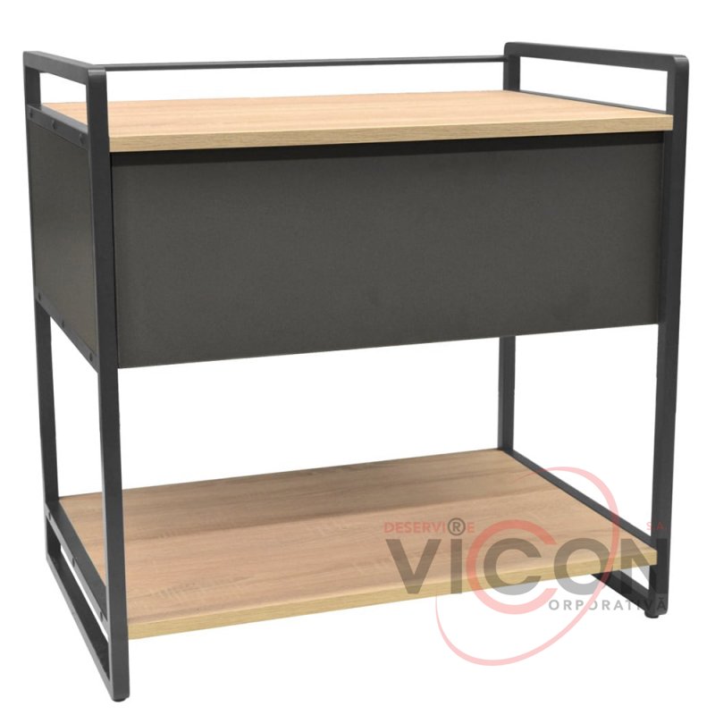 Fabricat pe o structură metalică sudată rezistentă, vopsit în câmp electrostatic și blat din PAL melaminat cantuit cu dimensiuni 54x50x74h cm, raftul dispune de 3 polițe generoase deschise și sertar glisant pentru păstrarea bunurilor și materialelor precum cartușe, cerneală, hârtie și accesorii birotică.