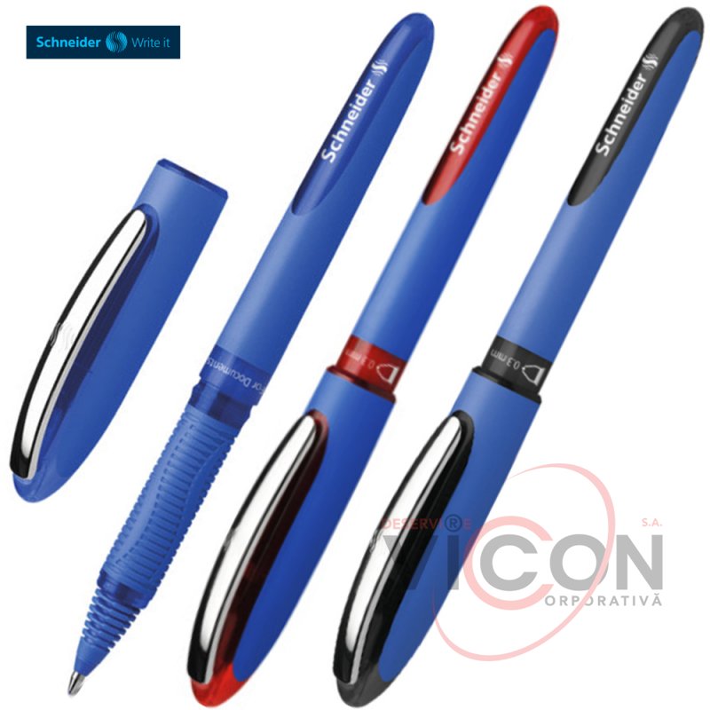 Roller Schneider One Hybrid C 03 cu varful conic din otel inoxidabil. Este captusit in interior cu plastic, ceea ce produce un scris extrem de lin si de usor. Sistemul inovator Super-Flow si zona de prindere cauciucata inlesnesc efortul de scriere. Cerneala este rezistenta la apa, astfel ca rollerul poate fi folosit pe documente oficiale.