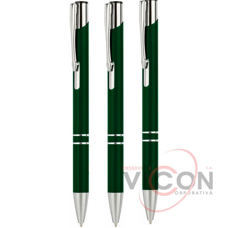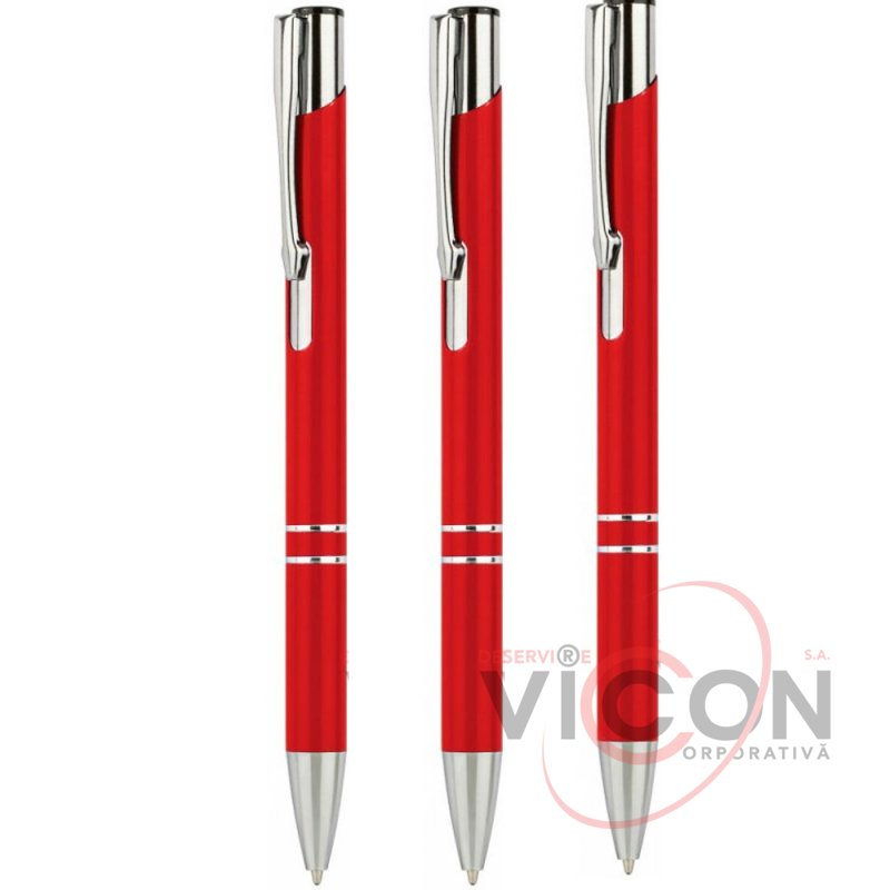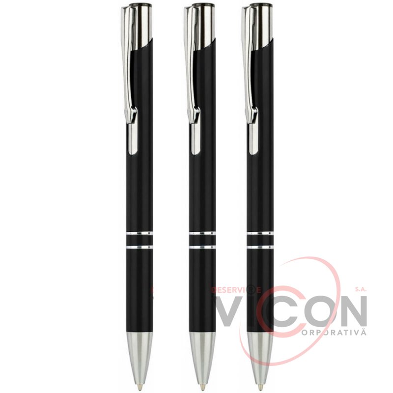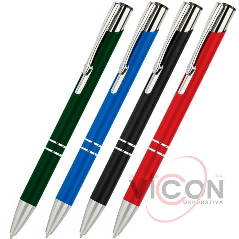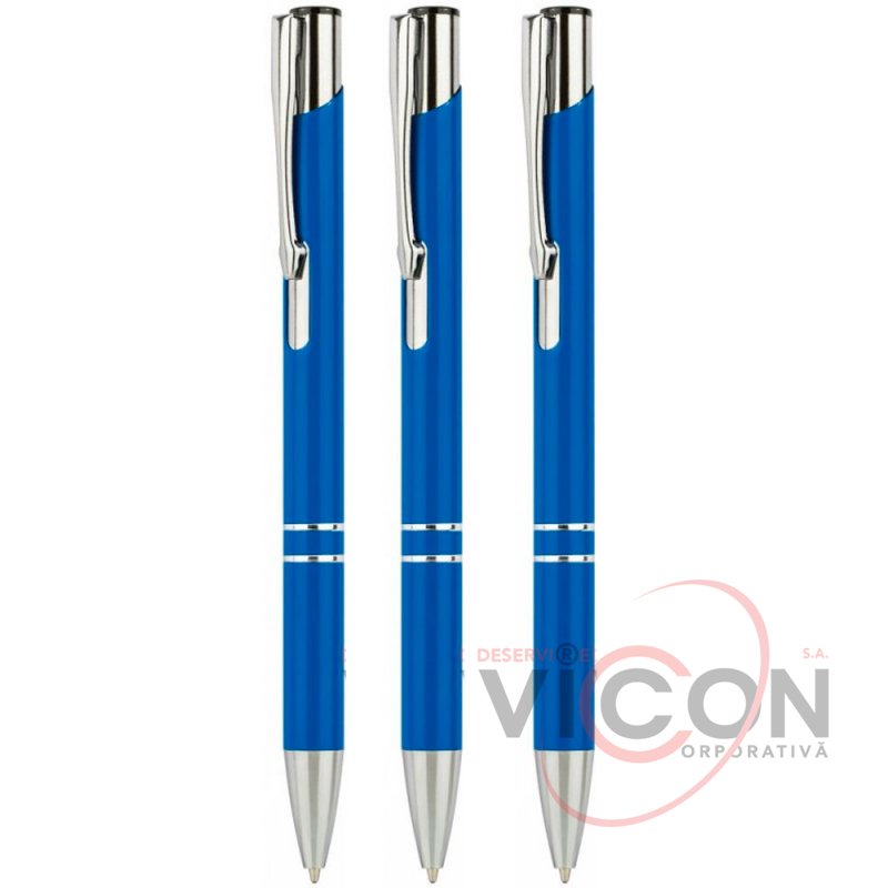Pix metalic cu buton, scrie albastru Poate fi personalizat cu logo-ul dumneavoastră