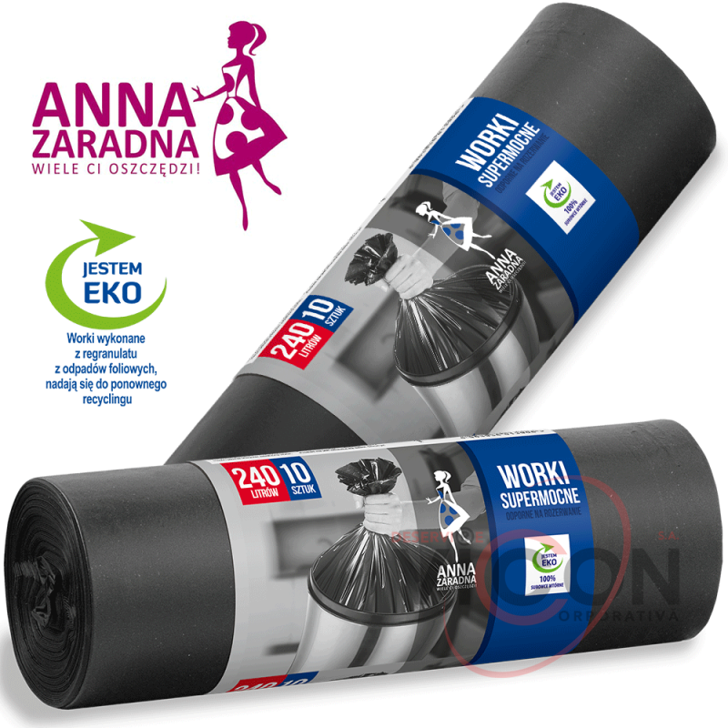 Saci de gunoi pentru ambalarea deșeurilor menajere și a gunoiului. Pungile de gunoi rezistente sunt fabricate din folie groasă de LDPE cu regranulat, făcându-le rezistente la stres și la rupere accidentală. Pungile au așa-numita garnitură inferioară în formă de stea, ceea ce face fundul pungii foarte strâns și se potrivește perfect în recipientele rotunde pentru deșeuri. Sunt minunate pentru casă, birou și spații publice. Potrivit pentru majoritatea coșurilor de gunoi. Pungile de gunoi Anna Zaradna sunt fabricate din folie granulată reciclată și sunt reciclabile.