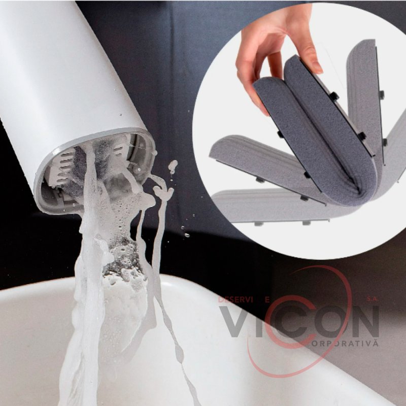 Pentru a începe curățenia, pur și simplu scufundați mopul sub un jet de apă și, cu o mișcare ușoară a mâinii, storcați-l folosind un mecanism special. Datorită buretelui super absorbant, mopul nostru nu va lăsa urme sau dungi pe nicio suprafață a podelei, precum și pe tavan și ferestre.