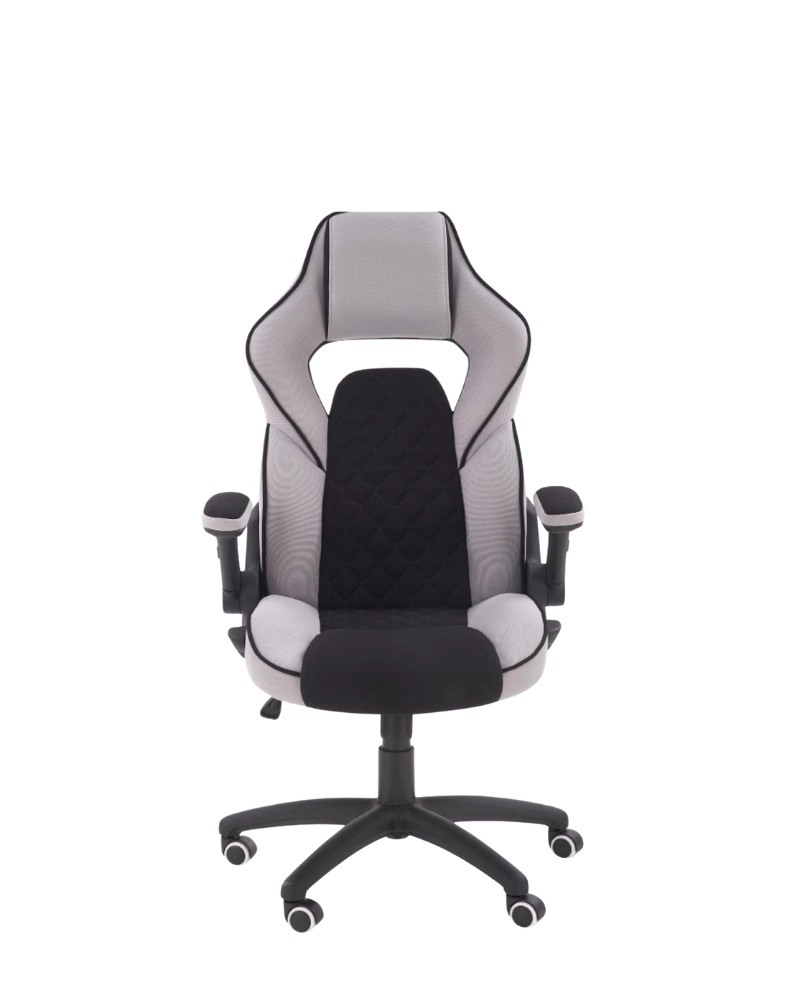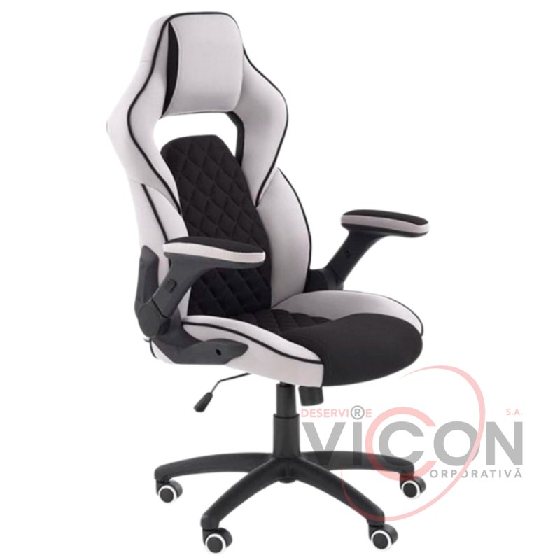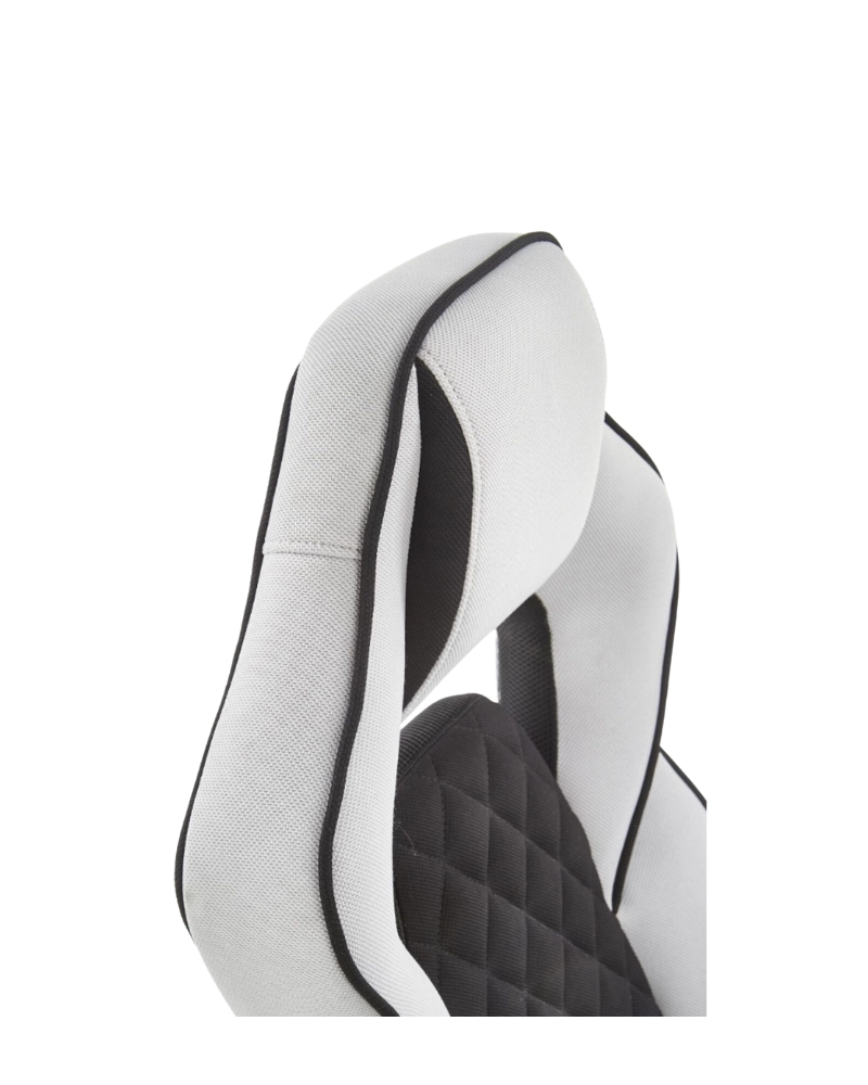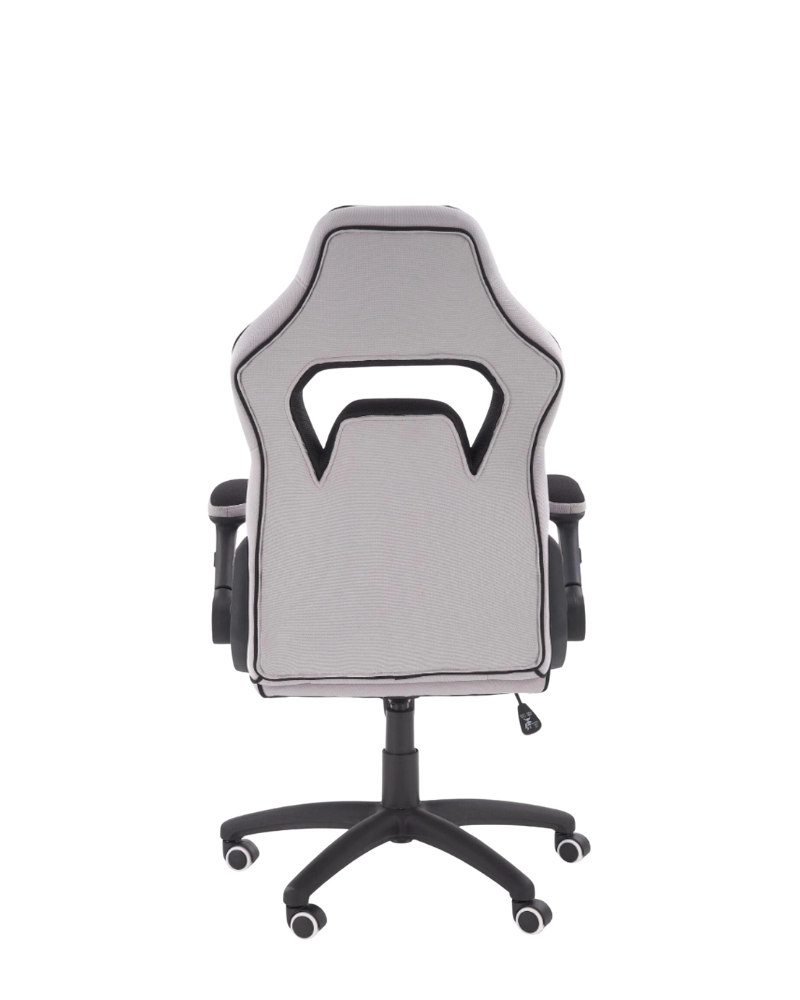Scaun de joc pe o bază de plastic cu role cauciucate. Tapițeria este o combinație de țesături gri și negre. Cotierele elegante se sprijină în spate, ceea ce conferă utilizatorului confortul când se ridică de pe scaun. Este instalat un mecanism de balansare TILT.