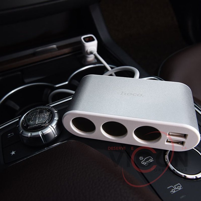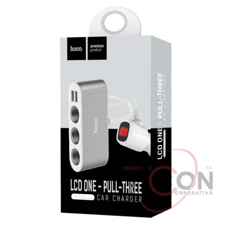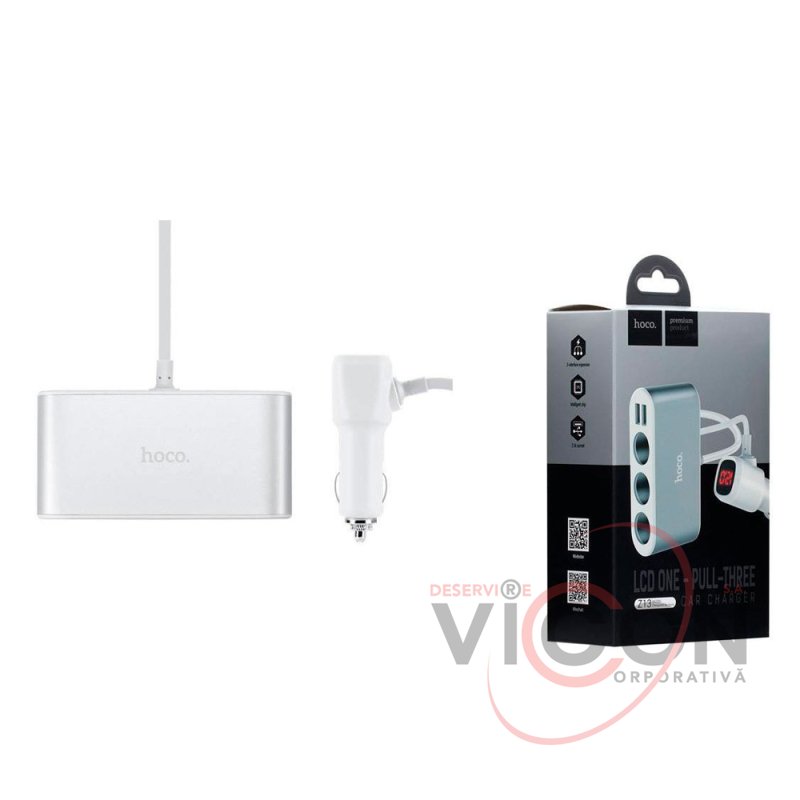 Hoco Z13 este un încărcător multifuncțional cu un cablu integrat (55 cm lungime), două porturi USB standard (2,1 A MAX) și trei prize pentru brichetă, precum și un afișaj LED care indică tensiunea bateriei auto, tensiunea de ieșire și amperajul.