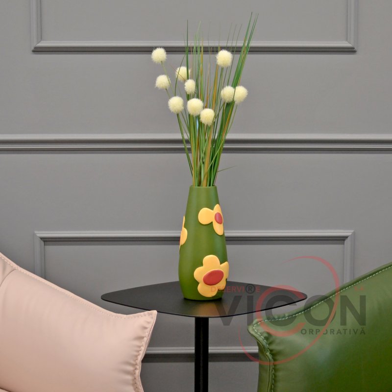 Numele «Vaza Verde cu Flori» sugerează o conexiune directă cu natura, iar această vază nu face excepție. Este o comoară decorativă care aduce cu sine prospețimea grădinii în spațiul tău, transformând locuința într-un sanctuar de frumusețe și armonie. Plasată în centrul unei mese, pe o consolă sau într-un colț special, această vază reprezintă nu doar un obiect decorativ, ci și o declarație artistică a eleganței și conectării cu natura.