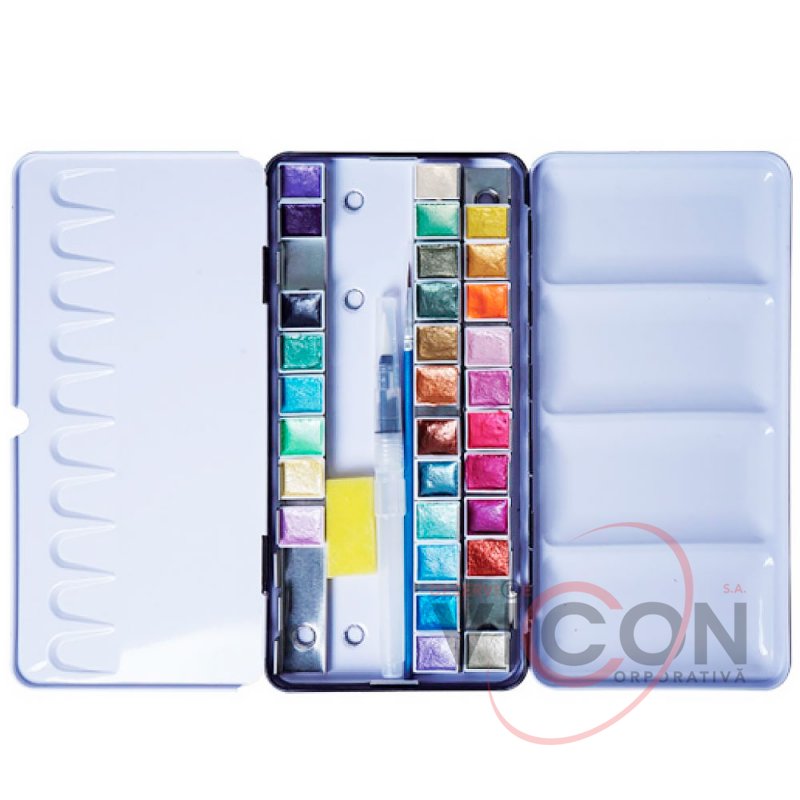 Акварель Conda 32 жемчужных цвета+кисть резервуар (металлическая коробка)