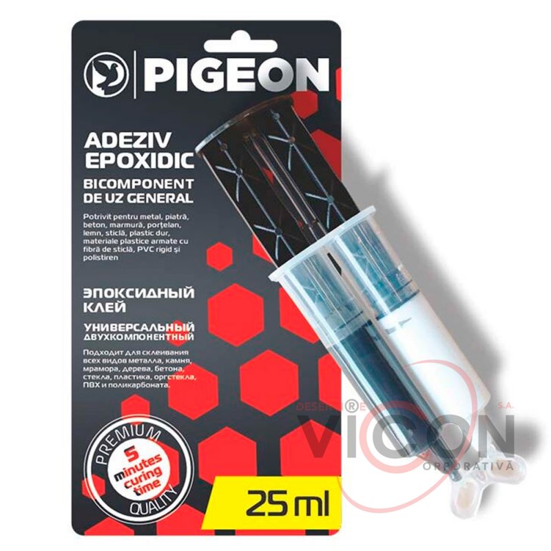 Сильный, быстро твердеющий эпоксидный клей PIGEON применяют для склеевания различных деталей из металла, дерева, ПВХ, стекла, керамики, фарфора и других материалов, а также для заливки трещин и сколов. Проявляет стойкость к действию щелочей и разбавленной кислоте. Не меняет цвета, не трескается и не даёт усадку при твердении. После склеивания возможна покраска, выполнение отверстий и полировка.