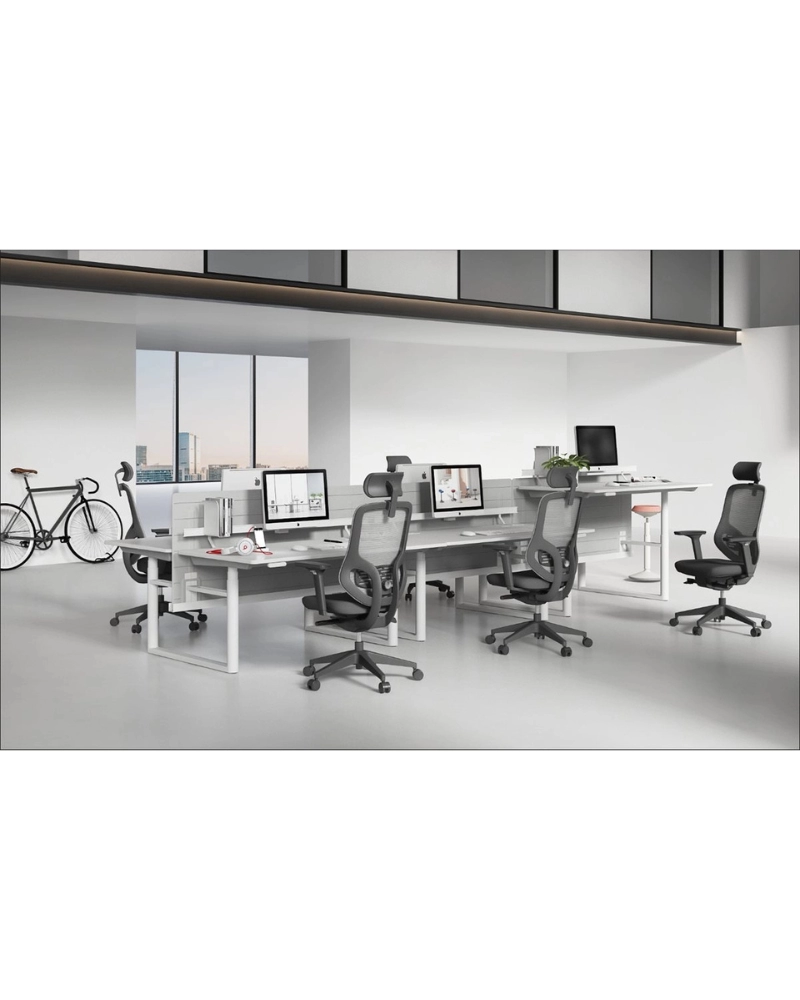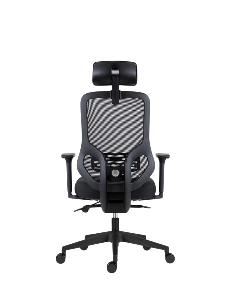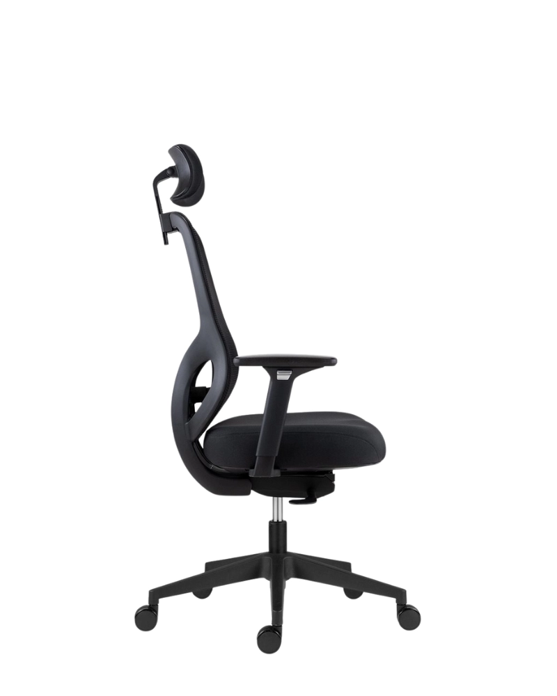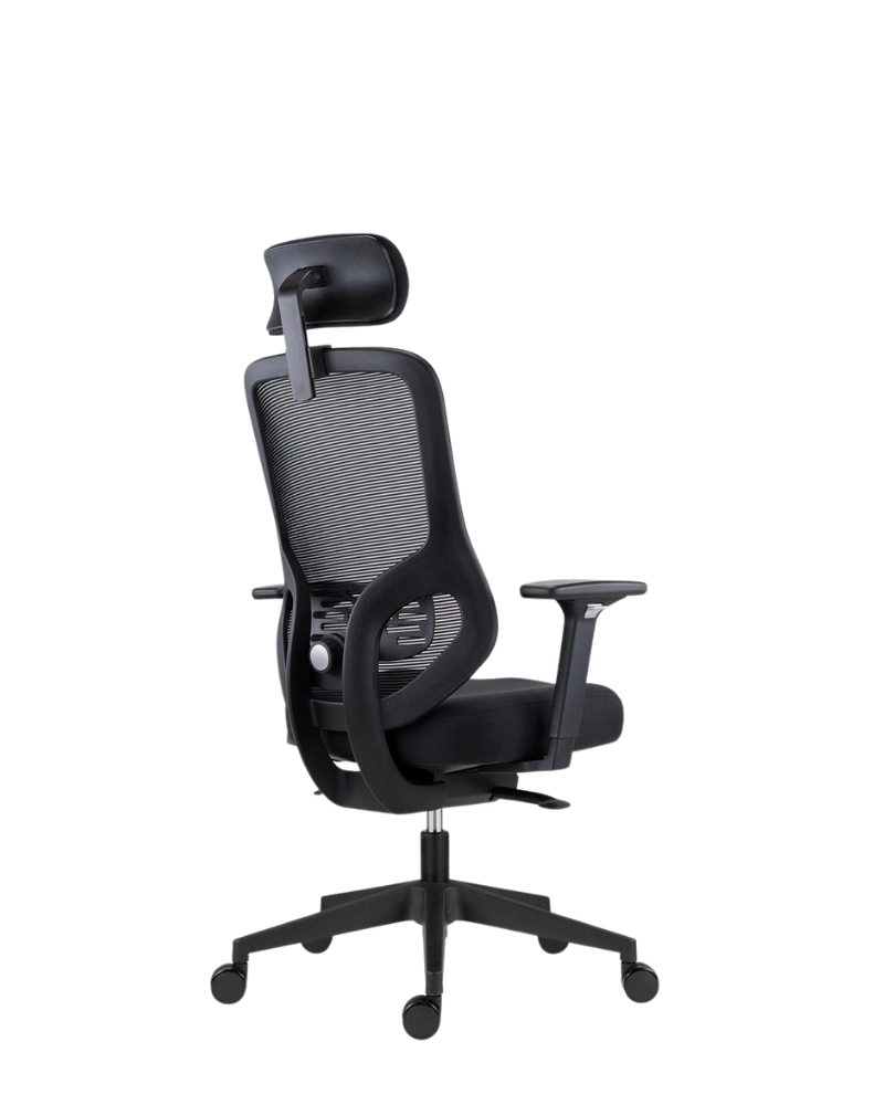 Офисное кресло с сетчатой спинкой, обитым сиденьем и подголовником.