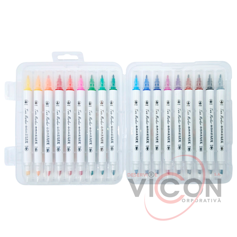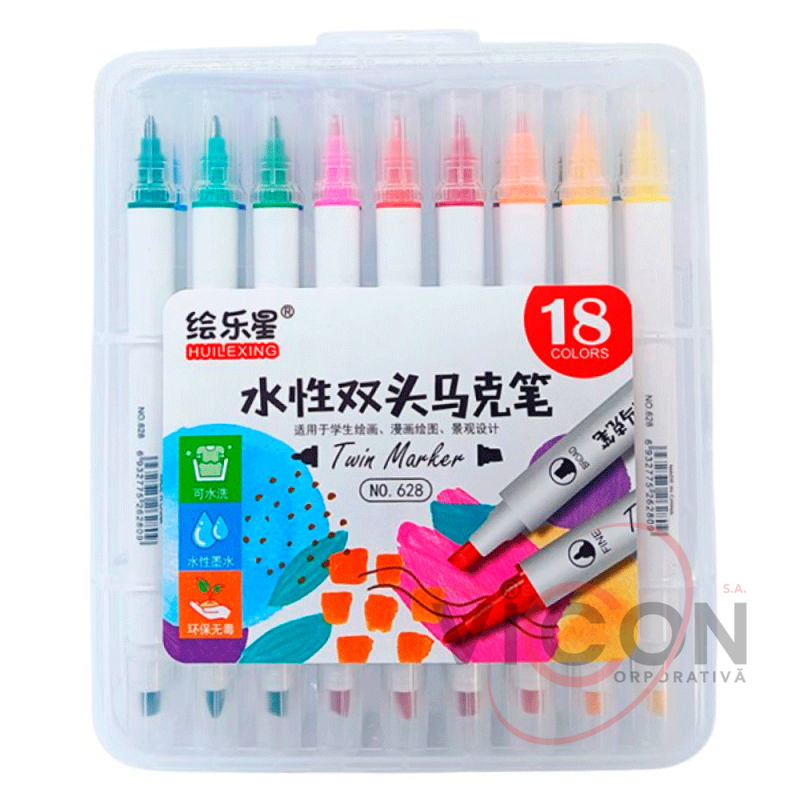 Фломастеры 18 цветов, двухсторонние, скошенный и круглый (пластиковая коробка)