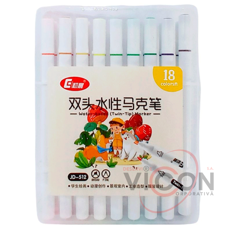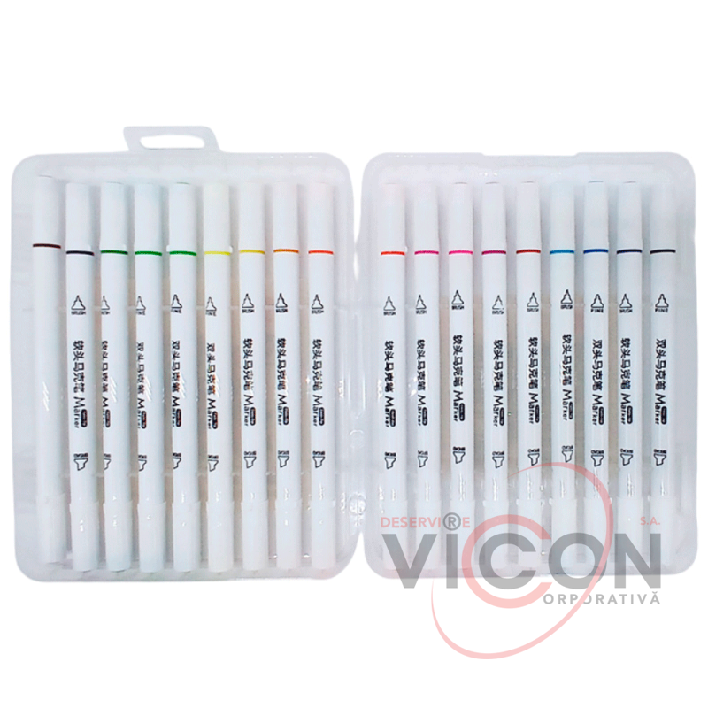 Фломастеры 18 цветов, двухсторонние, скошенный и круглый (пластиковая коробка)