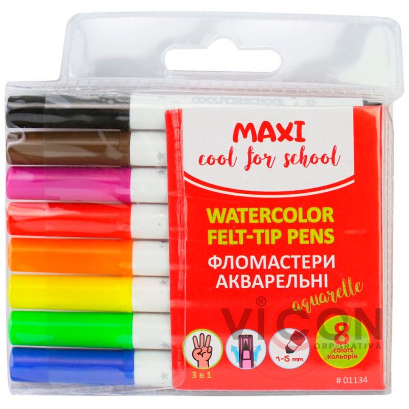 Пишущий узел фломастера можно использовать для создания тонких линий в 1 мм и широких в 5 мм. Для создания рисунков с акварельным эффектом следует увлажнить обычную кисточку и провести им по готовому рисунку фломастером. Яркие насыщенные цвета. Материал корпуса – полипропилен, оснащен вентилируемым колпачком, чернила на водной основе.