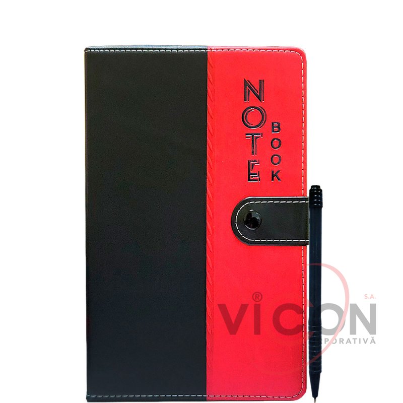 Блокнот в твердом переплете из искусственной кожи с кнопкой, черно-красного цвета+ручка