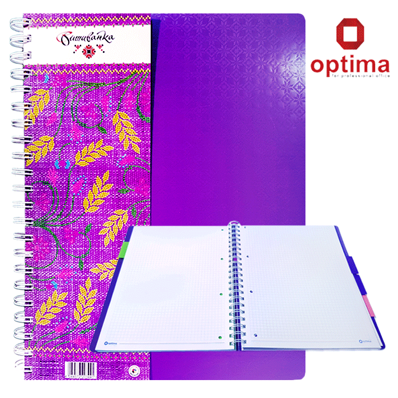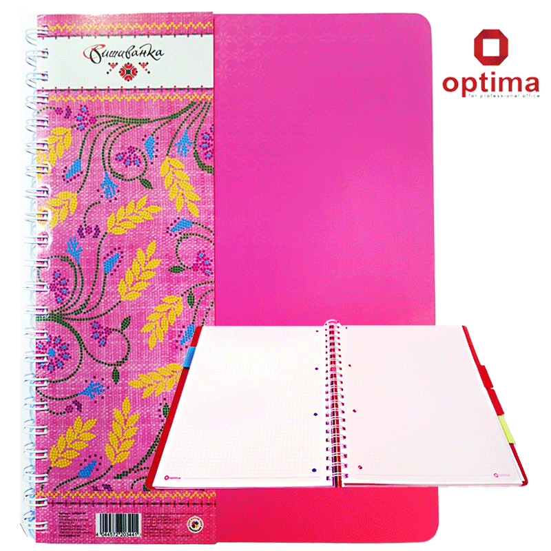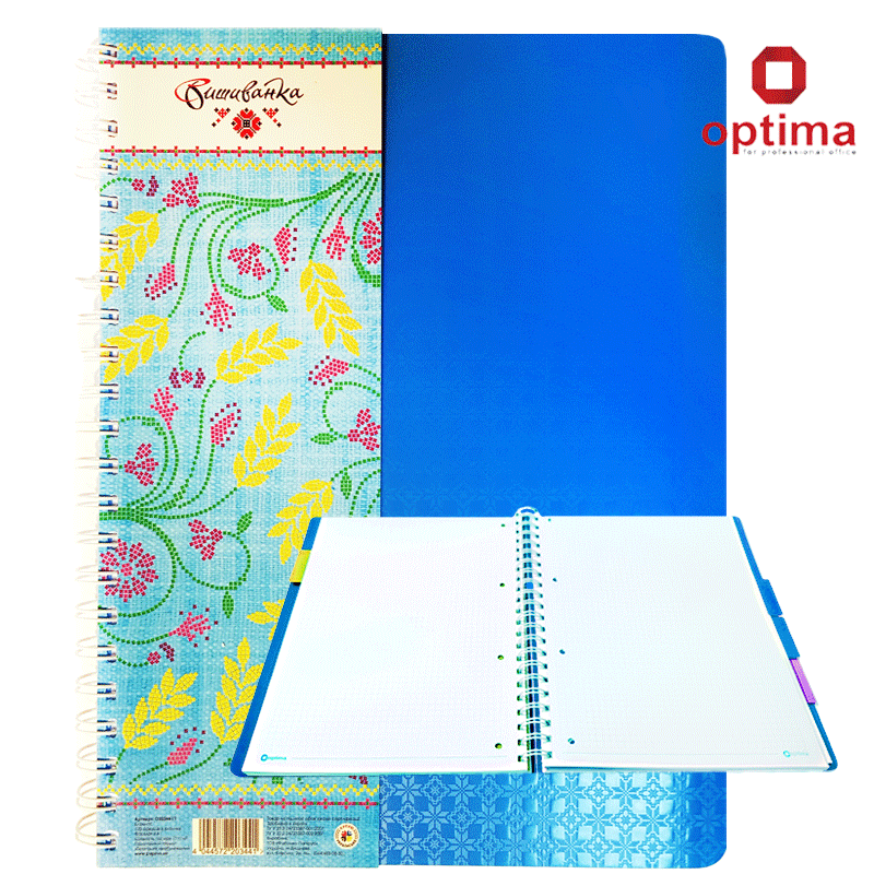 Тетрадь А4 «Вышиванка» Серия выполнена в пяти цветовых вариантах. Боковая спираль. Пластиковая обложка, вставка из плотного картона, пластиковые разделители. Бумага белая офсетная - 70 г/м2. 120 листов в клетку. Упаковка ассорти и по цветам. Производство: Украина.