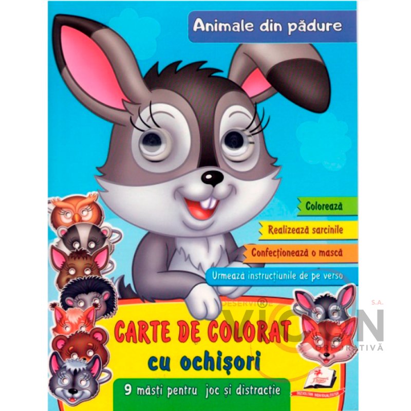 Carte de colorat cu ochisori. Animale din padure. 9 masti
