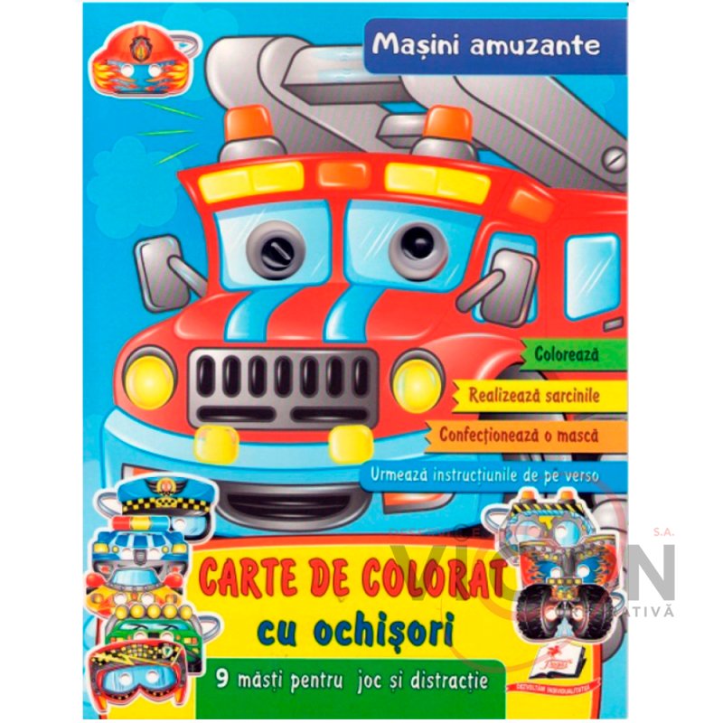 Carte de colorat cu ochisori. Masini amuzante. 9 masti