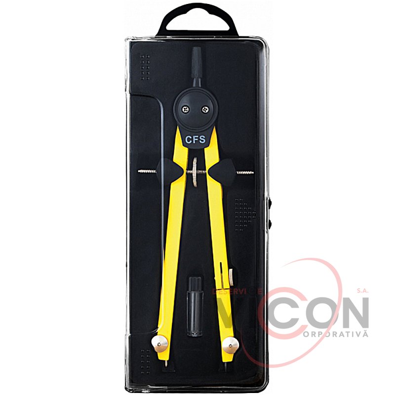 Металлический циркуль с запасным грифелем, быстрая и точная установка радиуса за счет микрометрического винта, обе ножки с шарниром; в пластиковой коробке с подвесом.