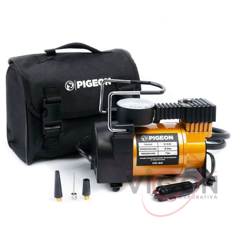 Автомобильный компрессор Pigeon представляет собой полупрофессиональное оборудование, которое необходимо для накачивания шин автомобилей любых типов. Высокий уровень производительности автомобильного компрессора предоставляет возможность использовать для любого вида транспорта. В комплектацию насоса входит универсальный шланг длинной один метр, кабель – три метра, а также штекер прикуривателя и практичная сумка для компрессора.