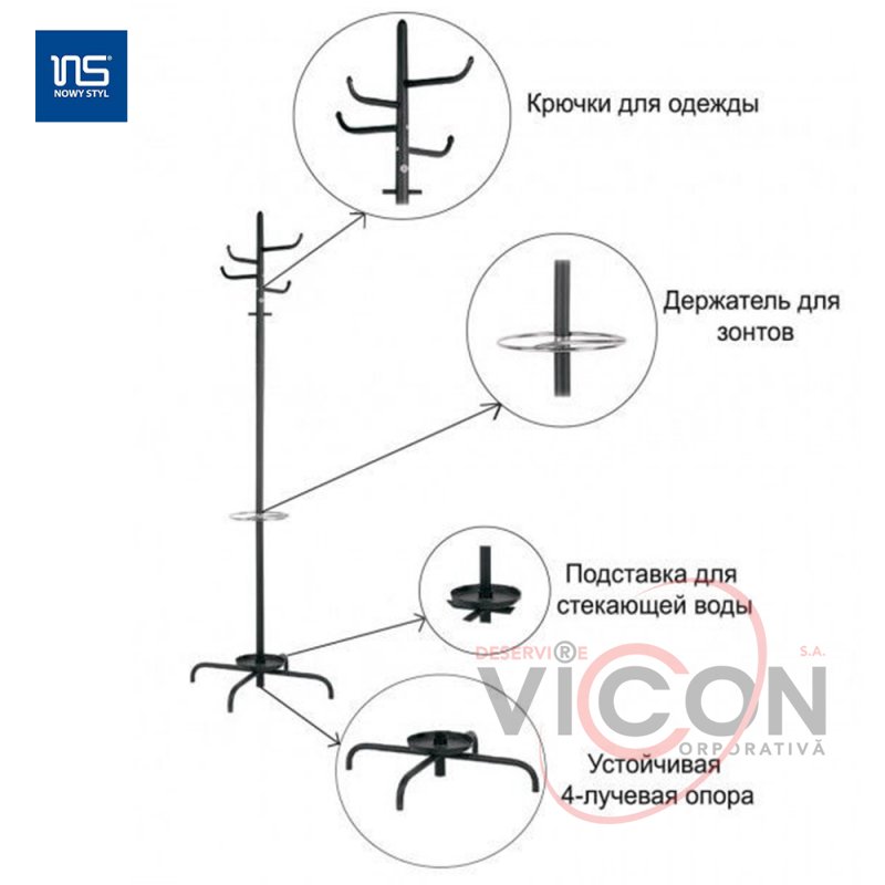 Конструкция напольной вешалки изготовлена из цельной металлической трубы, а также металлических держателей для одежды.
