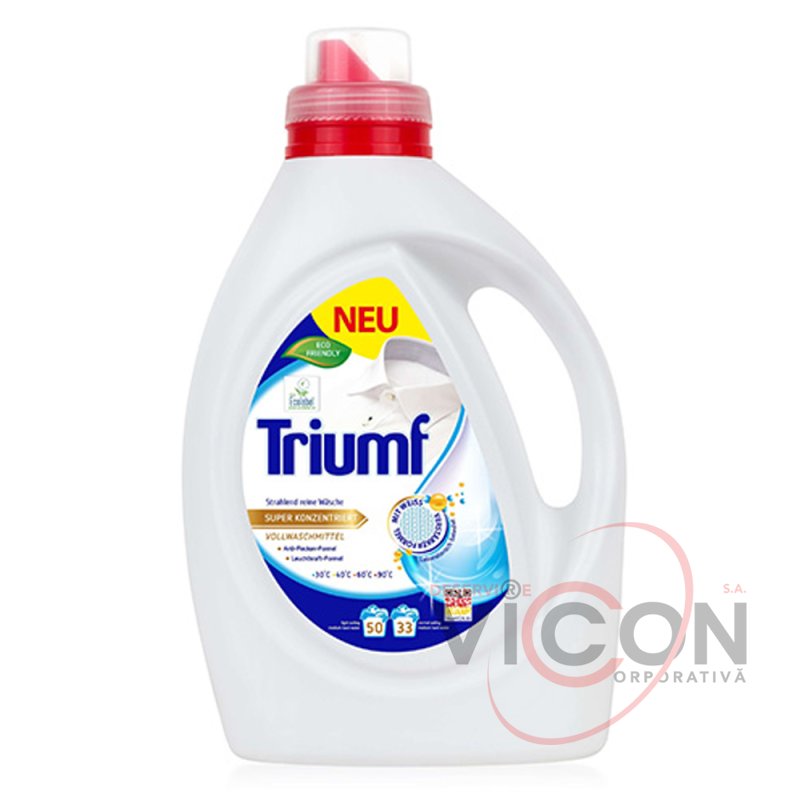 Triumf White является отличным жидким моющим средством для стирки как в стиральных машинах, так и при ручной стирке при температурах от 30 до 90 ° С. Безопасен для окружающей среды, поскольку не содержит цеолитов. Он имеет сертификат Ecolabel ЕС.