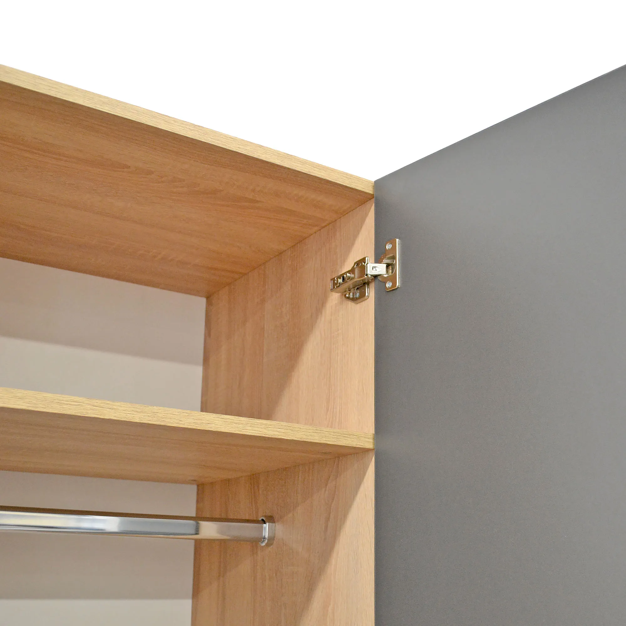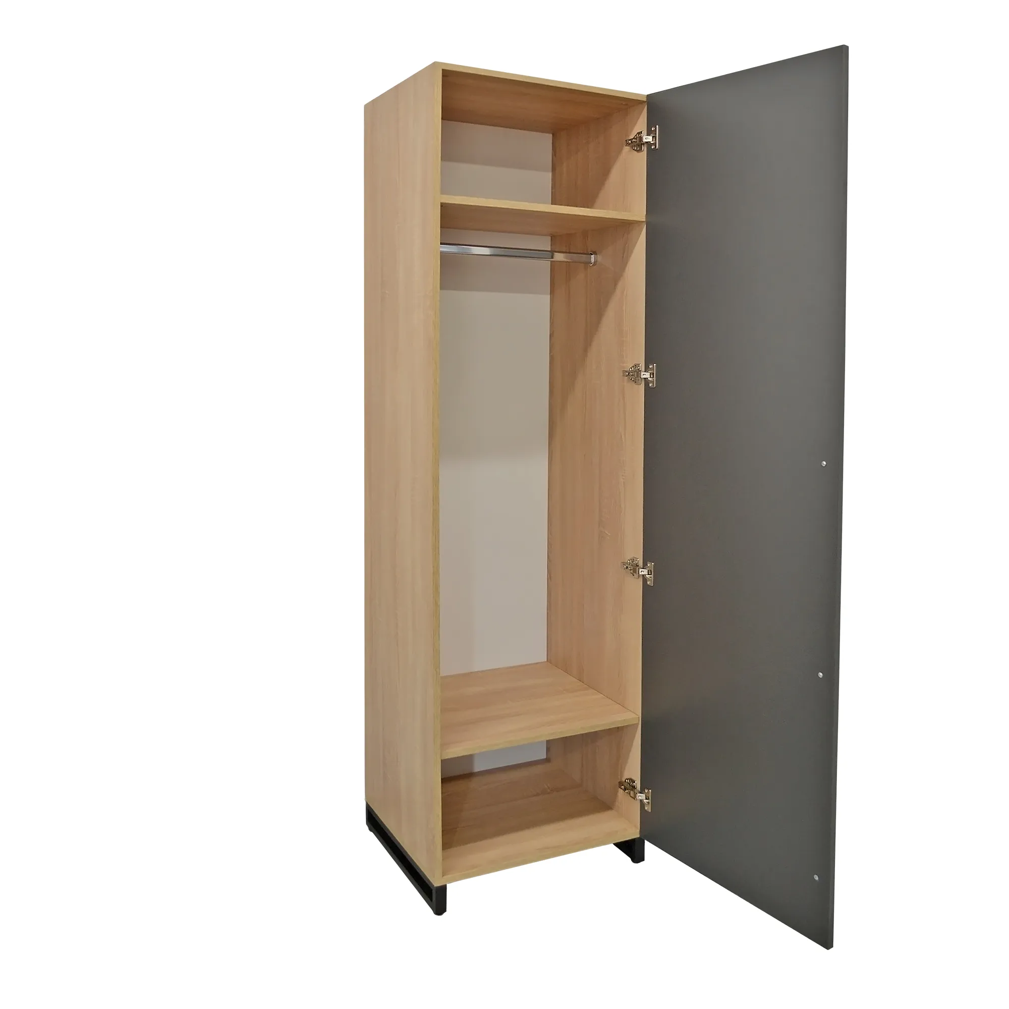 Шкаф имеет 2 полки высотой 30 см и оснащен штангой, предназначенной для вешалок.