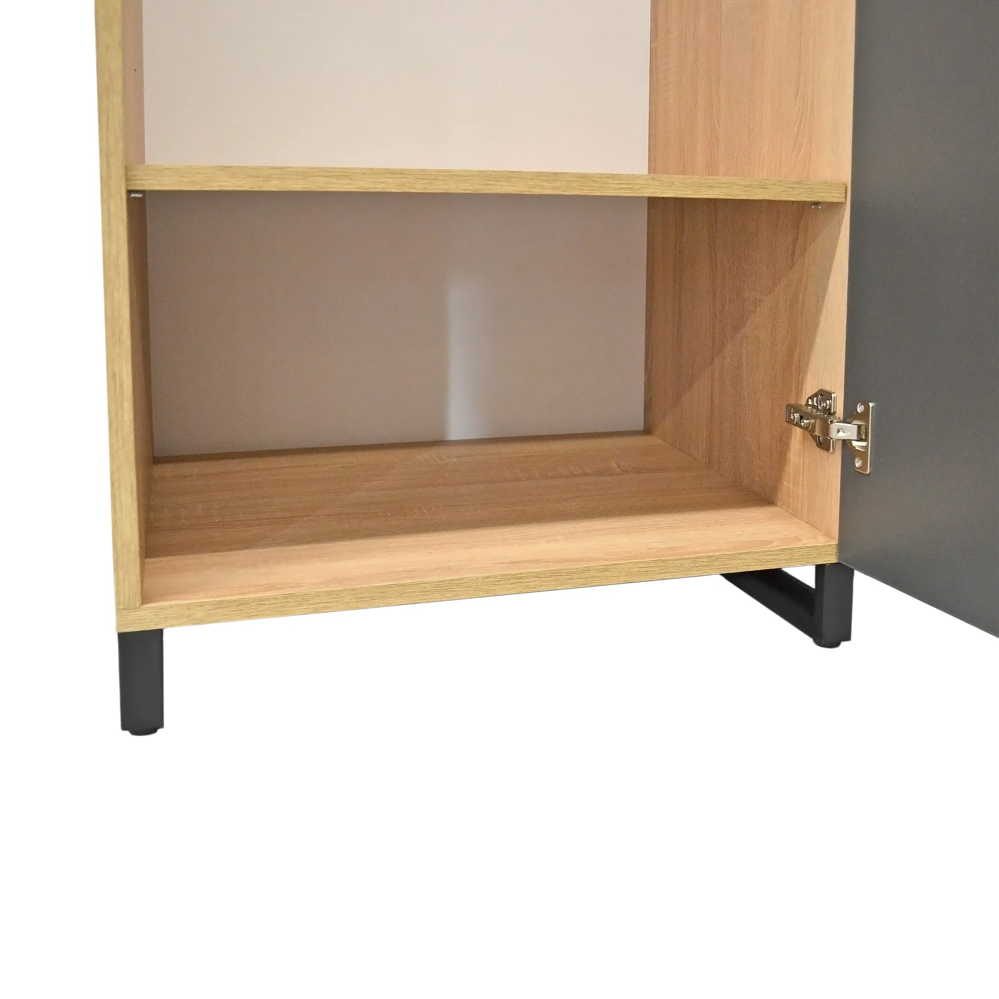 Шкаф изготовлен из прочных металлических ножек, окрашенных в электростатическом поле, и столешницы из обрезного ЛДСП толщиной 18 мм.