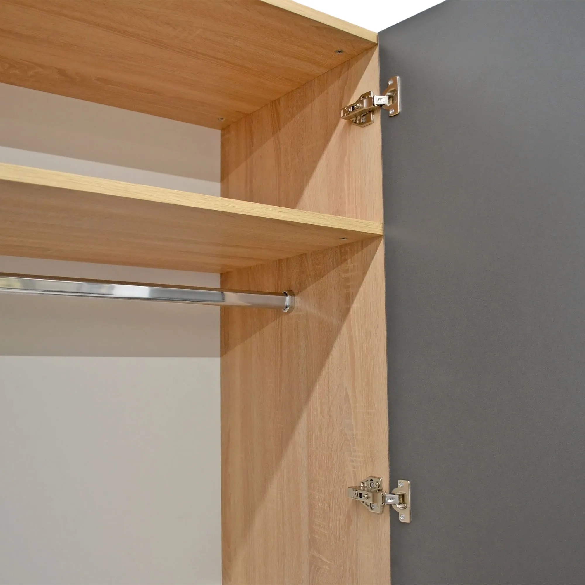 Шкаф имеет 2 полки с высотой между ними 30 см, 3 полки с высотой между ними 32 см и оснащен штангой, предназначенной для вешалок.