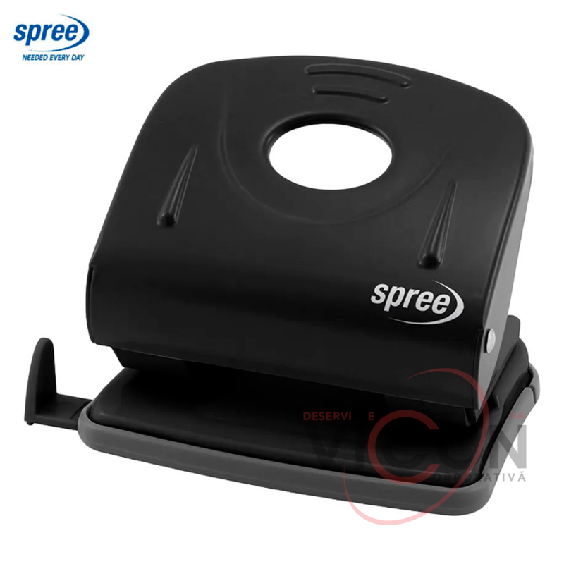 Дырокол Spree. Корпус выполнен из качественного метала. Все основные и рабочие механизмы — металлические. Пробивная мощность до 30 листов. Диаметр отверстия небольшой, всего 6 мм, расстояние между пробитыми отверстиями 80 мм. Для удобства дырокол оснащен выдвижной ограничительной линейкой с точной шкалой форматов бумаги. Съемный резервуар для конфетти. Прорезиненная подошва, которая предотвращает скольжение дырокола по поверхности.