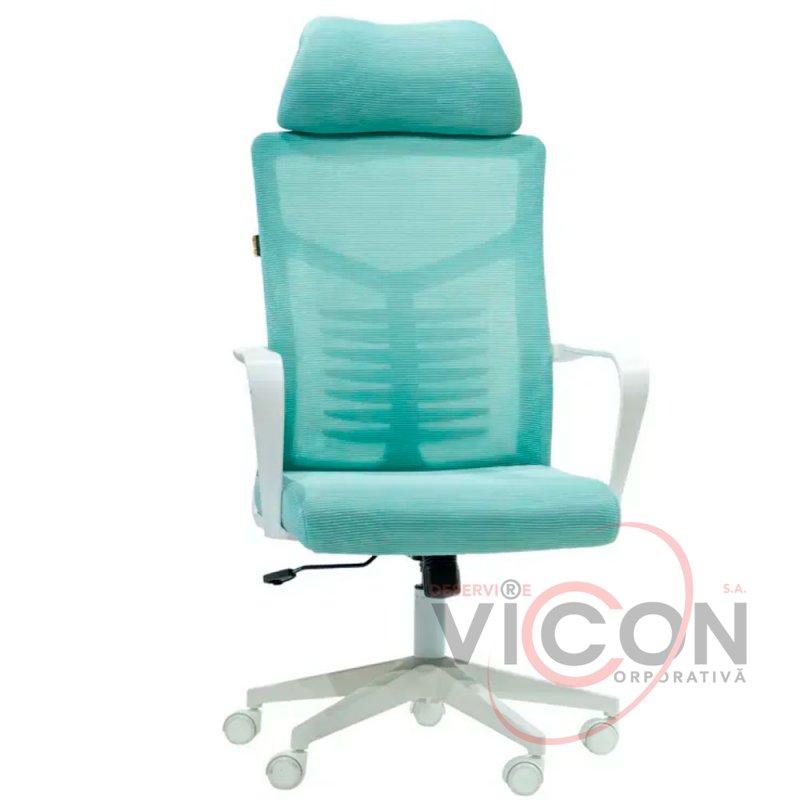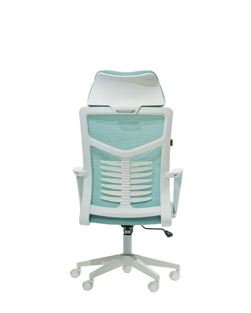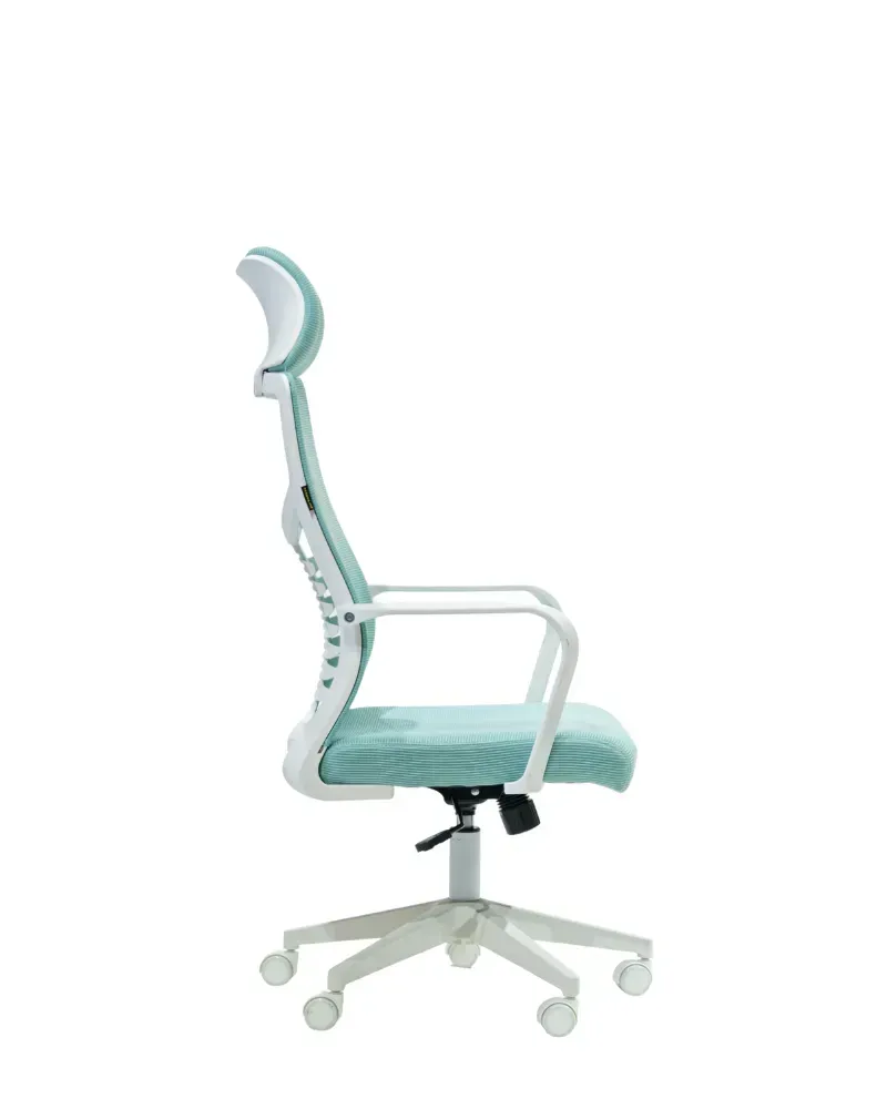 Эргономичное кресло с сетчатой спинкой и поясничным упором. Подголовник мягкий, без дополнительных регулировок. Оснащено механизмом качания TILT (свободное качание или фиксация в исходном положении). Пластиковая белая крестовина с пластиковыми роликами. Подлокотники не регулируются.