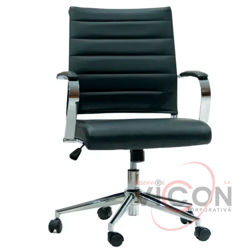 Прочная металлическая крестовина на роликах гарантирует устойчивость и лёгкость передвижения. Кресло оснащено механизмом качания TILT. Обивка - черная экокожа.