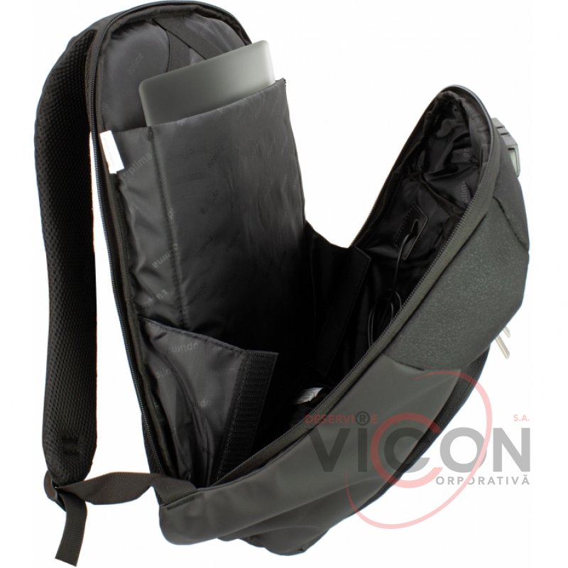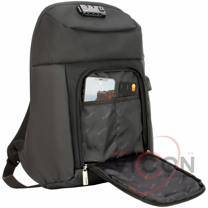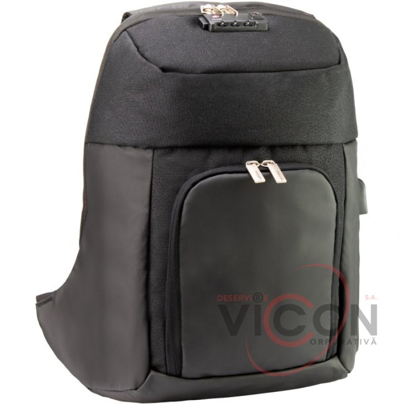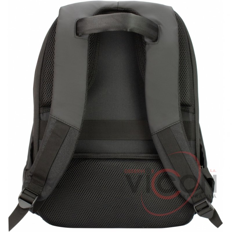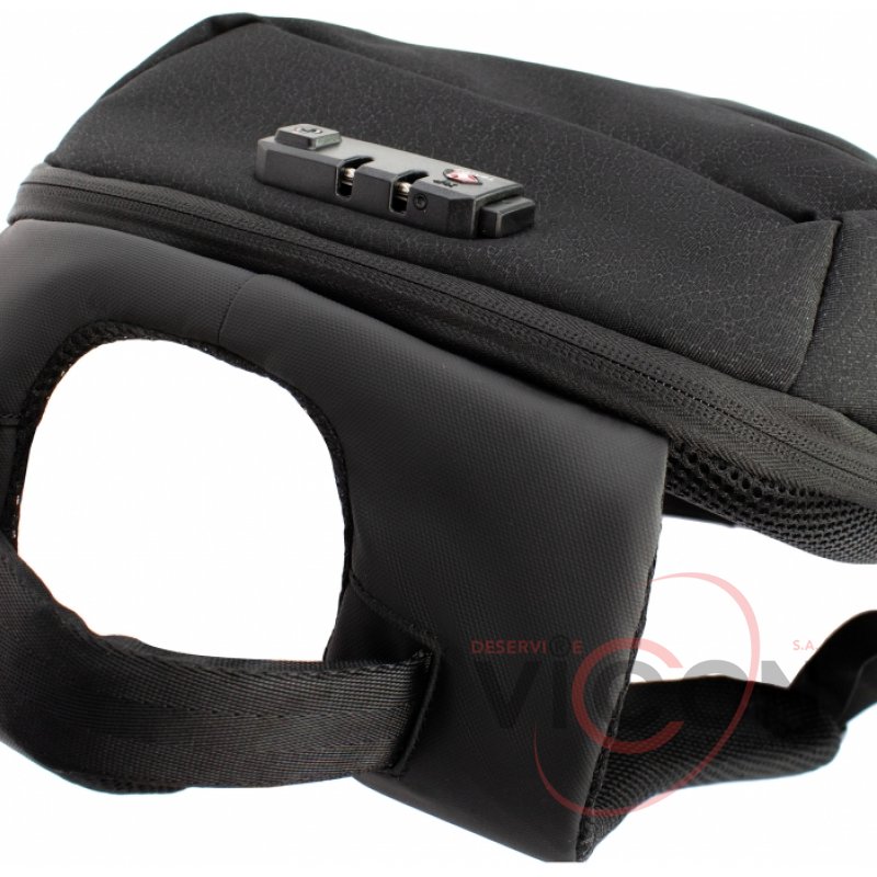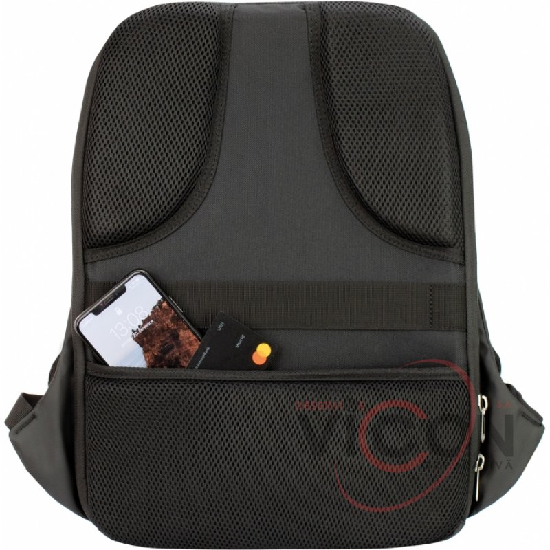 Размер: 44*31*14cm. Конструкция с системой Anti-Theft против краж и вскрытия с кодовым замком. Материал: полиэстер с PU покрытием на переднем кармане и по бокам; внешний USB-порт, съемный брелок для ключей; анатомическая спинка с мягкими вставками; Laptop-карман и карман для планшета; 1 отделение на молнии; 1 передний карман, потайной карман на спинке, отдельный карман для Power bank, органайзер; металлическая фурнитура, двойные застежки; крепкая ручка; спинка уплотнена PE вставкой; эргономичные S-образные регулируемые лямки.