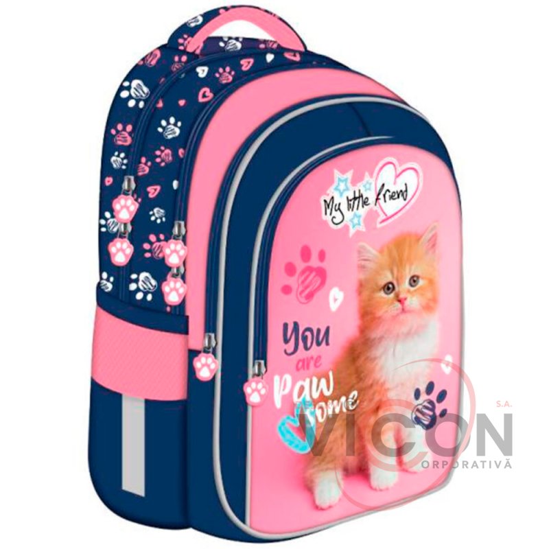 Рюкзак для I-IV классов, 4 отделения, Majewski, My Little Friends Ginger Kitty Collection, современный и удобный рюкзак, очень хорошего качества. Рюкзак изготовлен из водонепроницаемых материалов, устойчивых к износу и морозу. Рюкзак особенно вместительный, с отличным разделением по отделениям, в нем есть места для книг, блокнотов, аксессуаров и расходных материалов, что обеспечивает очень хорошую организацию. Оснащен основным отделением, закрывающимся на две молнии, и тремя передними отделениями, закрывающимися на молнии. Одно из передних отделений оснащено несколькими внутренними перегородками (предназначенными для таких предметов, как ключи, деньги, карты памяти, аксессуары для телефона, пишущие принадлежности или другие мелкие важные предметы), а также съемным кольцом для ключей. Рюкзак оснащен двумя боковыми карманами с сеткой, идеально подходящими для хранения емкости с водой. Рюкзак оснащен светоотражающими элементами спереди, по бокам и на лямках. Рюкзак снабжен губчатой ручкой, поэтому его можно носить и в руке. Спинка и лямки усилены и покрыты толстой губкой, что придает им жесткость и защищает плечи и спину. Задняя часть рюкзака имеет эргономичную губку и снабжена сетчатой контактной зоной для хорошей циркуляции воздуха. Лямки рюкзака регулируются. Основание рюкзака имеет прорезиненные контактные зоны для защиты от влаги. Размеры рюкзака следующие: 40х28х18 см.